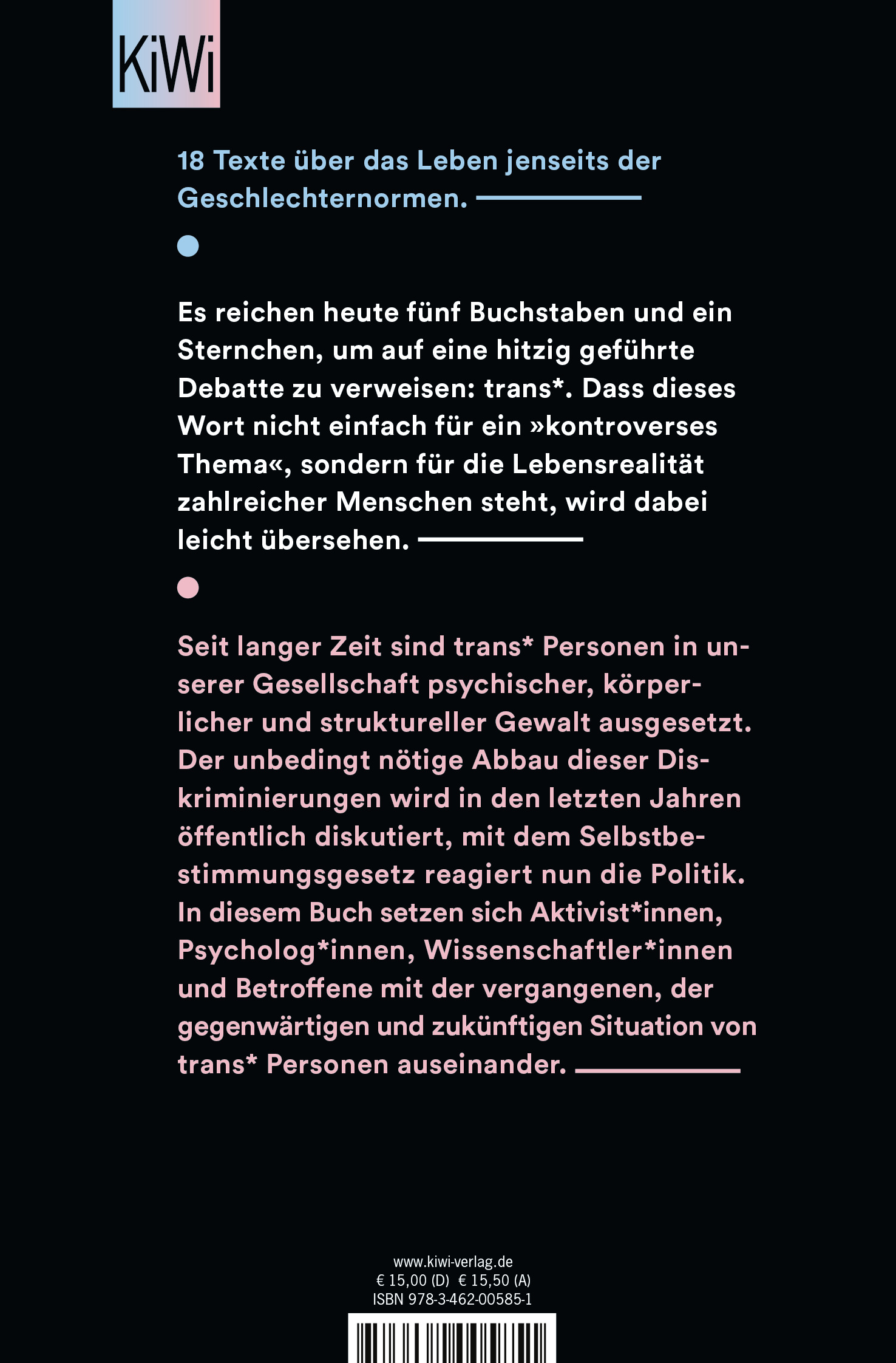 Umso wichtiger ist Aufklärung: Dieses Buch enthält 20 Texte, von Aktivist*innen, Psycholog*innen, Wissenschaftler*innen und Betroffenen, deren Stärke darin liegt, dass sie ein differenziertes, unaufgeregtes Bild dessen entwerfen, was ein Leben jenseits der Geschlechternormen ist.