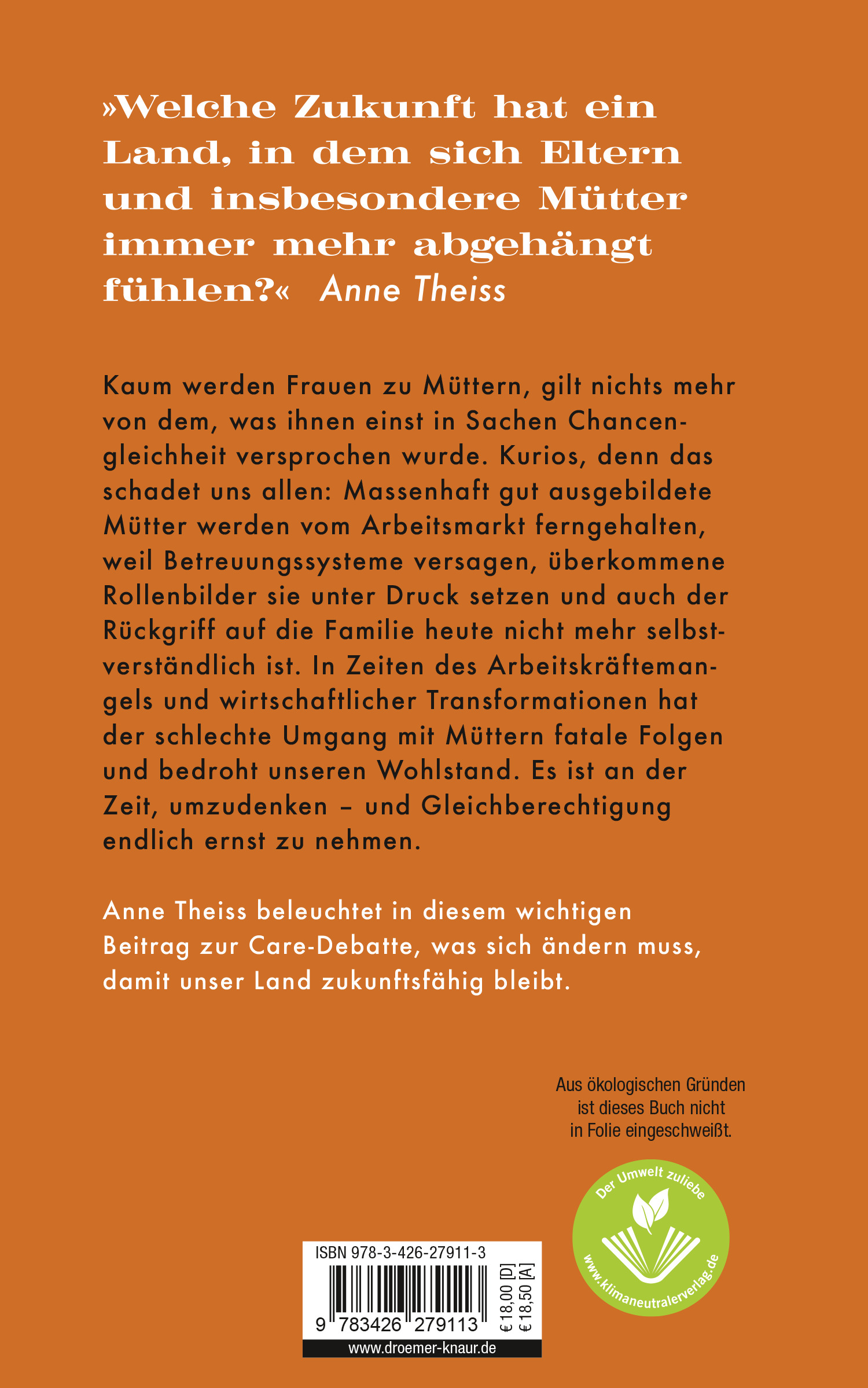 Klug und pointiert skizziert Anne Theiss in diesem Buch die Missstände, an denen sich bis heute wenig geändert hat und zeigt, wie die Politik ihre Verantwortung gegenüber Müttern und Familien endlich ernst nehmen kann. Sie beleuchtet, warum ein »Weiter so« langfristig das Wirtschafts-Modell der Bundesrepublik gefährdet und warum wir es besser nicht so weit kommen lassen.