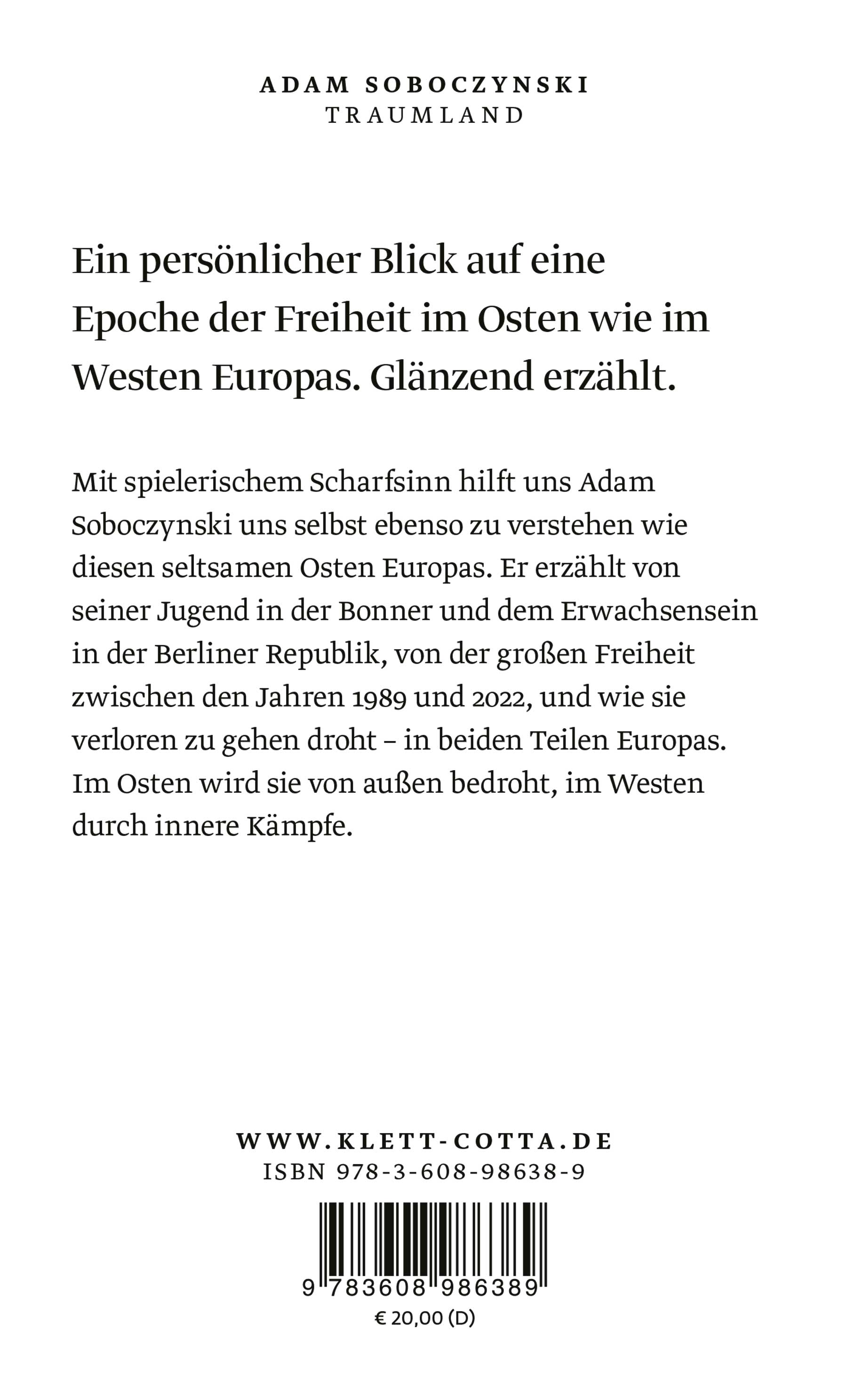 Mit spielerischem Scharfsinn hilft uns Adam Soboczynski uns selbst ebenso zu verstehen wie diesen seltsamen Osten Europas. Er erzählt von seiner Jugend in der Bonner und dem Erwachsensein in der Berliner Republik, von der großen Freiheit zwischen den Jahren 1989 und 2022, und wie sie verloren zu gehen droht – in beiden Teilen Europas. Im Osten wird sie von außen bedroht, im Westen durch innere Kämpfe.