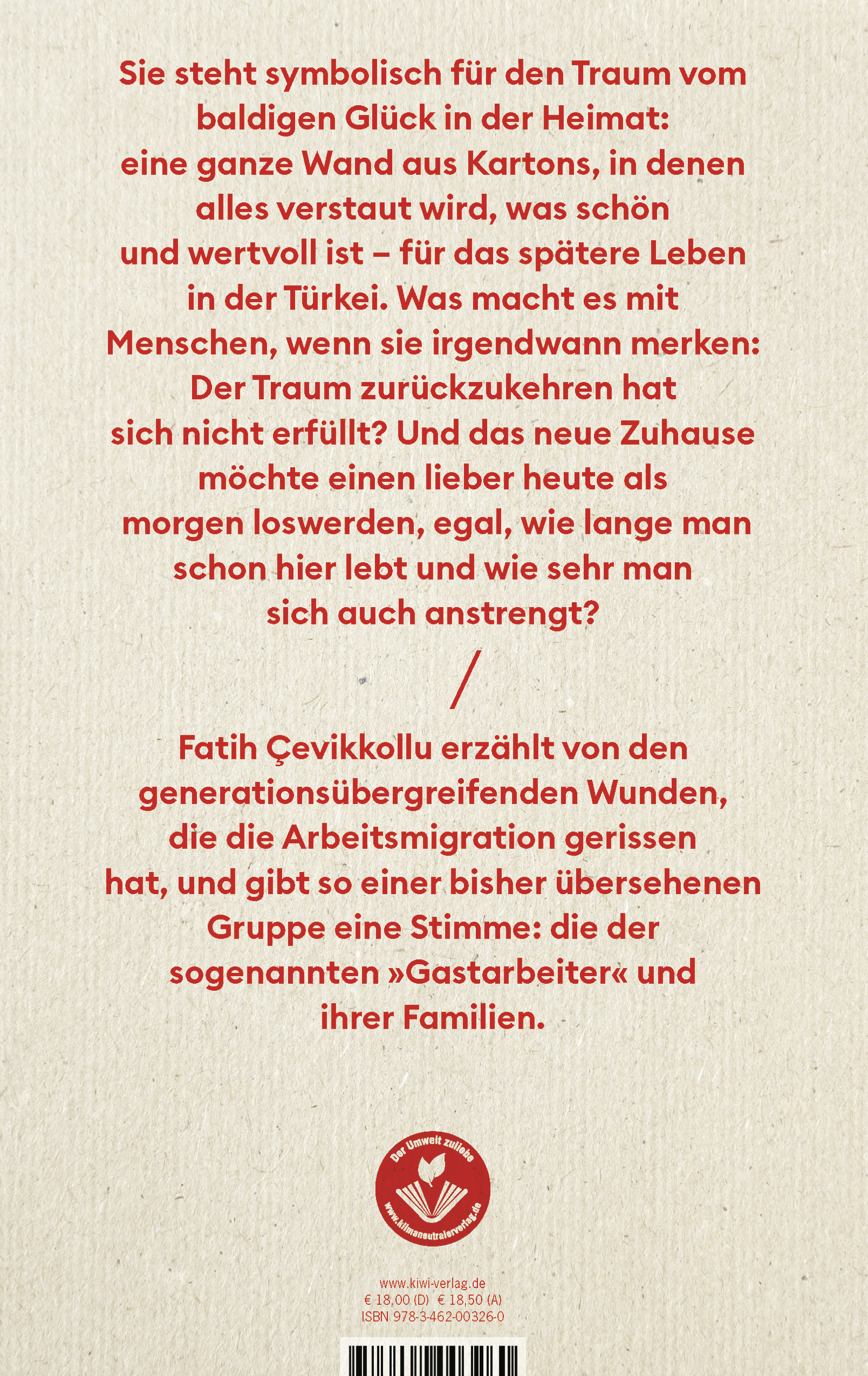 Alle Arbeitsmigrant:innen kennen sie, denn sie steht symbolisch für den Traum vom baldigen Glück in der Heimat: eine ganze Wand aus Kartons, in denen alles verstaut wurde, was schön und wertvoll war – für das spätere Leben in der Türkei. Willkommen war man in Deutschland nicht, doch was hält man nicht alles aus, wenn es nur von kurzer Dauer ist? Es lohnte sich weder, die deutsche Sprache zu lernen, noch sich ein Zuhause zu schaffen, schließlich sollte es bald zurückgehen. Die Kinder wurden als Kofferkinder hin- und hergeschickt. Was macht es mit Menschen, wenn sie irgendwann merken: Der Traum zurückzukehren hat sich nicht erfüllt?