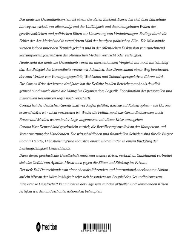 | Schlagworte | erkennbare Schwachpunkte und Risiken vor dem Hintergrund neuer Krisen • Gesundheitswesen im tiefen Fall • kritische Analyse des Gesundheitswesens • Schwachpunkte und Risiken angesichts einer alternden Gesellschaft • Verlust von Versorgungsqualität • Wohlstand und Zukunftssicherheit gefährdet |