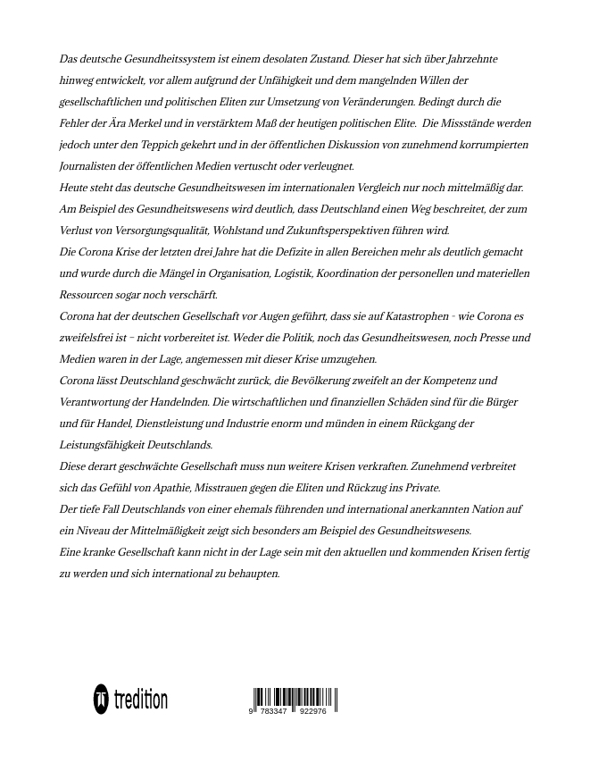 | Schlagworte | erkennbare Schwachpunkte und Risiken vor dem Hintergrund neuer Krisen • Gesundheitswesen im tiefen Fall • kritische Analyse des Gesundheitswesens • Schwachpunkte und Risiken angesichts einer alternden Gesellschaft • Verlust von Versorgungsqualität • Wohlstand und Zukunftssicherheit gefährdet |
