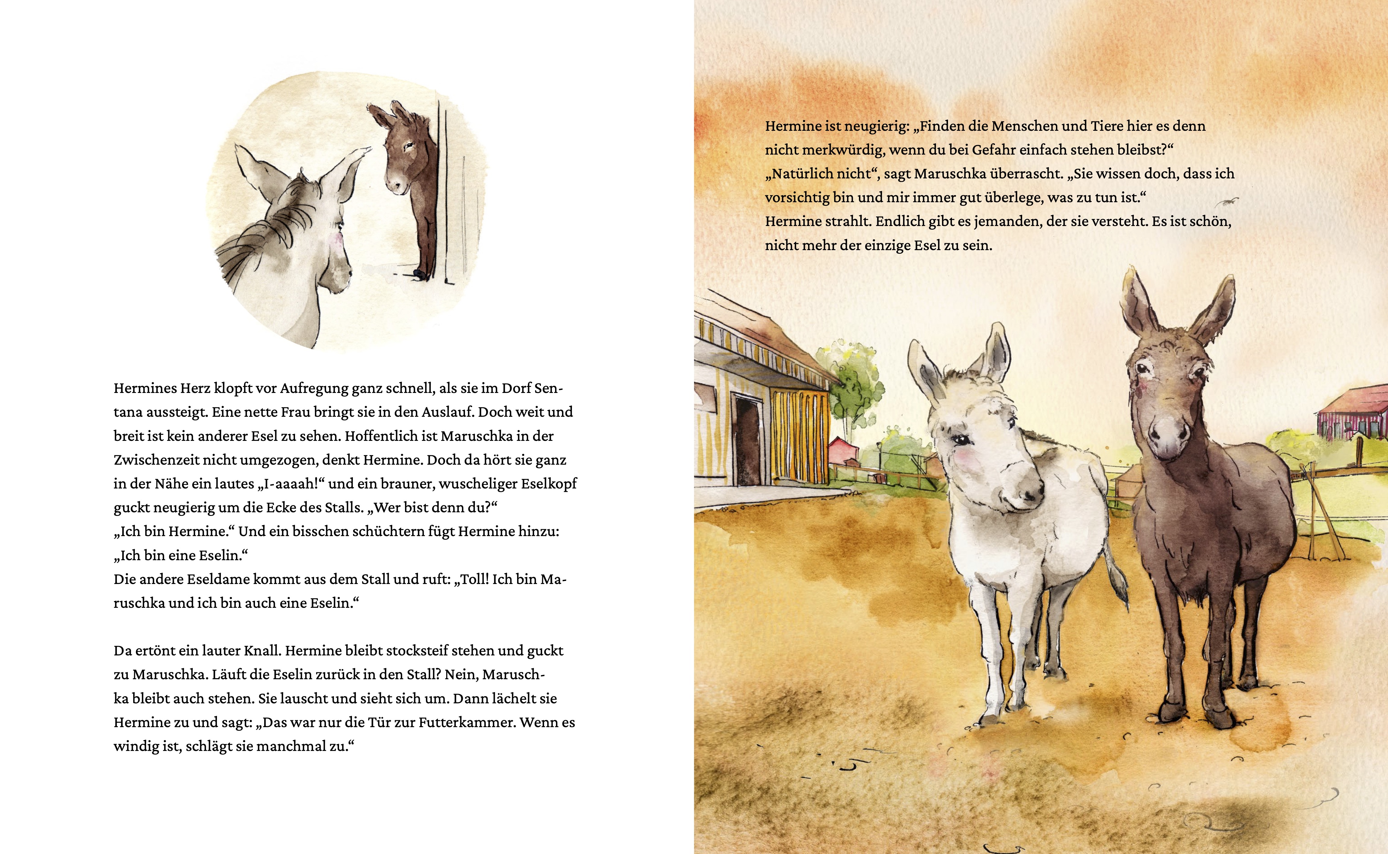 Hermine ist ein Esel. Aber das weiß Hermine nicht. Das hat ihr nämlich noch niemand verraten. Hermine ist einfach nur Hermine. Und Hermine zieht heute auf einen Ponyhof. Sie kann es nicht erwarten, dort Freunde zu finden. Doch das ist schwieriger als gedacht: Wenn sie mit den Ponys tobt, tun Hermine die Füße weh. Das Weidegras bereitet ihr Bauchschmerzen. Und die Kinder, die auf den Hof kommen, halten ihre Vorsicht für Sturheit. Bald fühlt Hermine sich einsamer als je zuvor. Mit jedem Tag wird sie trauriger ... bis sie schließlich etwas erfährt, das ihr Leben völlig auf den Kopf stellt!