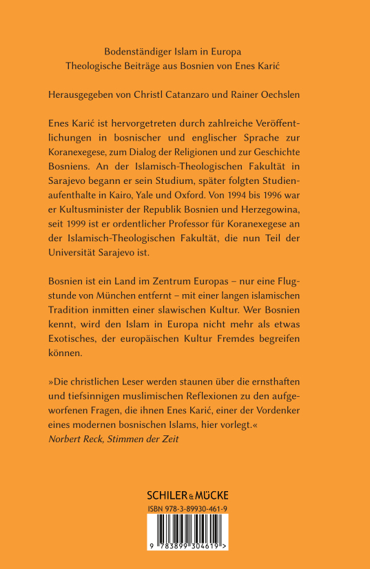 Enes Karic ist hervorgetreten durch zahlreiche Veröffentlichungen in bosnischer und englischer Sprache zur Koranexegese, zum Dialog der Religionen und zur Geschichte Bosniens. An der Islamisch-Theologischen Fakultät in Sarajevo begann er sein Studium, später folgten Studienaufenthalte in Kairo, Yale und Oxford. Von 1994 bis 1996 war er Kultusminister der Republik Bosnien und Herzegowina, seit 1999 ist er ordentlicher Professor für Koranexegese an der Islamisch-Theologischen Fakultät, die nun Teil der Universität Sarajevo ist. Bosnien ist ein Land im Zentrum Europas - nur eine Flugstunde von München entfernt - mit einer langen islamischen Tradition inmitten einer slawischen Kultur. Wer Bosnien kennt, wird den Islam in Europa nicht mehr als etwas Exotisches, der europäischen Kultur Fremdes begreifen können.