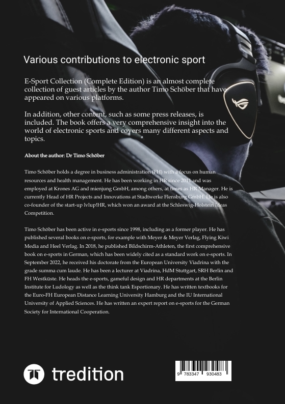Dr. Timo Schöber holds a degree in business administration (FH) with a focus on human resources and health management. He has been working in HR since 2011 and was employed at Krones AG and mienjung GmbH, among others, at times as Head of HR. He is currently Head of HR Projects and Innovations at Stadtwerke Flensburg GmbH. He is also co-founder of the start-up lvlup!HR, which won an award at the Schleswig-Holstein Ideas Competition. Timo Schöber has been active in e-sports since 1998, including as a former player. He has published several books on e-sports, for example with Meyer & Meyer Verlag, Flying Kiwi Media and Heel Verlag. In 2018, he published Bildschirm-Athleten, the first comprehensive book on e-sports in German, which has been widely cited as a standard work on e-sports. In September 2022, he received his doctorate from the European University Viadrina with the grade summa cum laude. He has been a lecturer at Viadrina, HdM Stuttgart, SRH Berlin and FH Westküste. He heads the e-sports, gameful design and HR departments at the Berlin Institute for Ludology as well as the think tank Esportionary. He has written textbooks for the Euro-FH European Distance Learning University Hamburg and the IU International University of Applied Sciences. He has written an expert report on e-sports for the German Society for International Cooperation.
