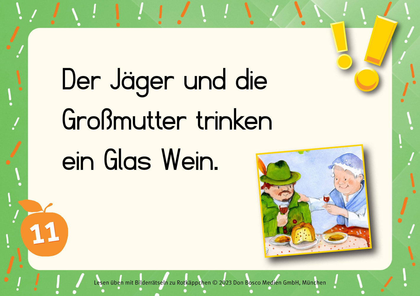 Wer wartet im Wald? Wen streichelt das Rotkäppchen? Womit schneidet der Jäger den Wolf auf? Das Lesetraining für Grundschüler kommt mit den Bilderrätseln zum Lieblingsmärchen ganz spielerisch daher! Auf stabilen Karten im Format A5 sind Illustrationen von Petra Lefin zum Märchen der Brüder Grimm abgebildet. Daneben steht eine Frage, deren Antwort sich in der Abbildung versteckt. Auf der Rückseite finden die kleinen Rätselfüchse nicht nur die Lösung, sondern auch den Bildausschnitt, auf den sich die Rätselfrage bezogen hat. So wird mit Märchenrätseln mühelos die Lesekompetenz gefördert. Dank drei verschiedener Niveaustufen eignen sich die Bildkarten als Leseübung in Klasse 1 und 2.