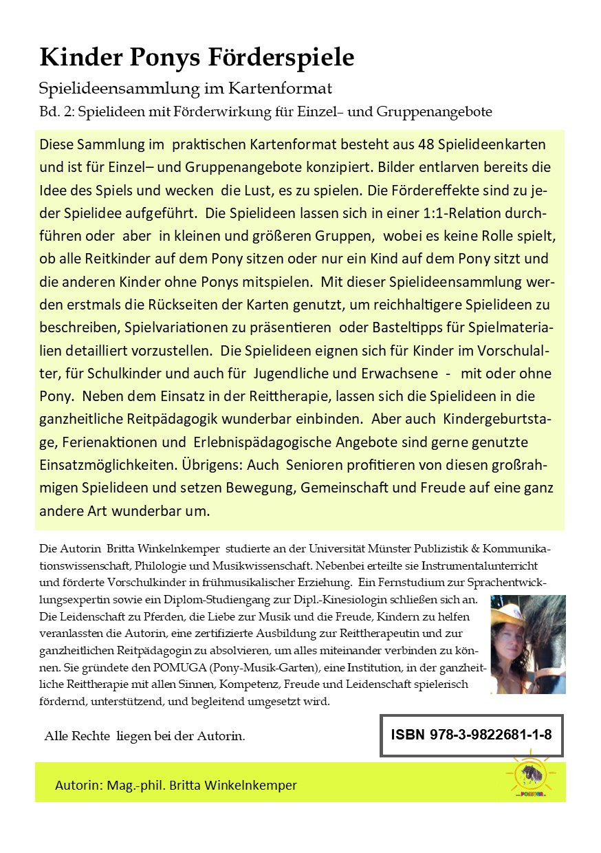 Diese Sammlung im praktischen Kartenformat besteht aus 48 einzelnen Spielideenkarten, die auf der Vorder- und Rückseite bedruckt sind. Die Karten sind für Einzel- und Gruppenspiele konzipiert. Bilder entlarven bereits die Idee des Spiels und wecken die Lust, es zu spielen. Die Fördereffekte sind zu jeder Spielidee aufgeführt. Die Spielideen lassen sich in einer 1.1-Relation durchführen oder aber in kleinen und größeren Gruppen, wobei es keine Rolle spielt, ob alle Reitkinder auf dem Pony sitzen oder nur ein Kind auf dem Pony sitzt und die andernen Kinder ohne Ponys mitspielen. Die Spielideen eignen sich für Kinder im Vorschulalter, für Schulkinder, Jugendliche, Erwachsene, Senioren -mit und ohne Pony. Neben dem Einsatz in der Reittherapie lassen sich die Spielideen in die ganzheitliche Reitpädagogik einbinden. Aber auch Kindergeburtstage, Ferienaktionen und Erlbebnispädagogische Angebote sind gerne genutzte Einsatzmöglichkeiten. Übrigens: Auch Senioren profitieren von diesen großrahmigen Spielideen und setzen Bewegung, Gemeinschaft und Freude auf eine ganz andere Art wunderbar um. Die Karten beinhalten zudem viele Basteltipps für Therapiematerialien und Ideen für Erlebnispädagogische Angebote.