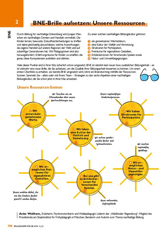 Die Mappe führt vor Augen, dass Bildung für nachhaltige Entwicklung (BNE) weit mehr ist als Beete bepflanzen oder Müll trennen. Sie findet auch beim Mittagessen, Malen oder beim Elternabend statt. BNE steckt nämlich überall drin. Die zahlreichen Ideen und Erfahrungen zeigen, wie sich das Thema als roter Faden und ohne erhobenen Zeigefinger durch die pädagogische Arbeit ziehen kann. Zudem finden Sie Impulse, wie sich Teams mit der Zukunftsfähigkeit auseinandersetzen können – und auch, wie man die vielen Anlässe im Alltag nutzen kann, um auch mit den Kindern über Fragen rund
