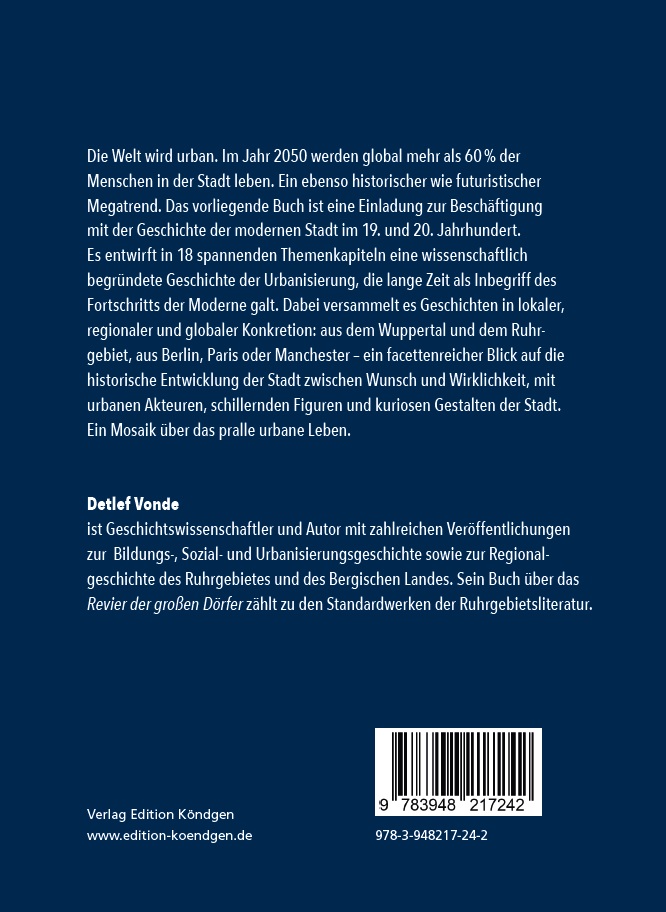 | Schlagworte | Barmen • Bergisches Land • Berlin • Bildung • Bildungslandschaften • Cholera • Concordia • Dörfer • Elberfeld • Engels • Epidemien • Facetten • Faucher • Fortschritt • Gemeindekneipen • Global • Kommunen • Kötter • lokal • Manchester • Megatrend • Moderne • Mosaik • Paris • Preußen • regional • Ruhrgebiet • Sachbuch • Schalke • Schnapskasinos • Schulen • Spanische Grippe • Stadtentwicklung • Stadtgeschichte • Tigges • Urbanisierung • Westermann • Wuppertal • Zivilisationskritik |