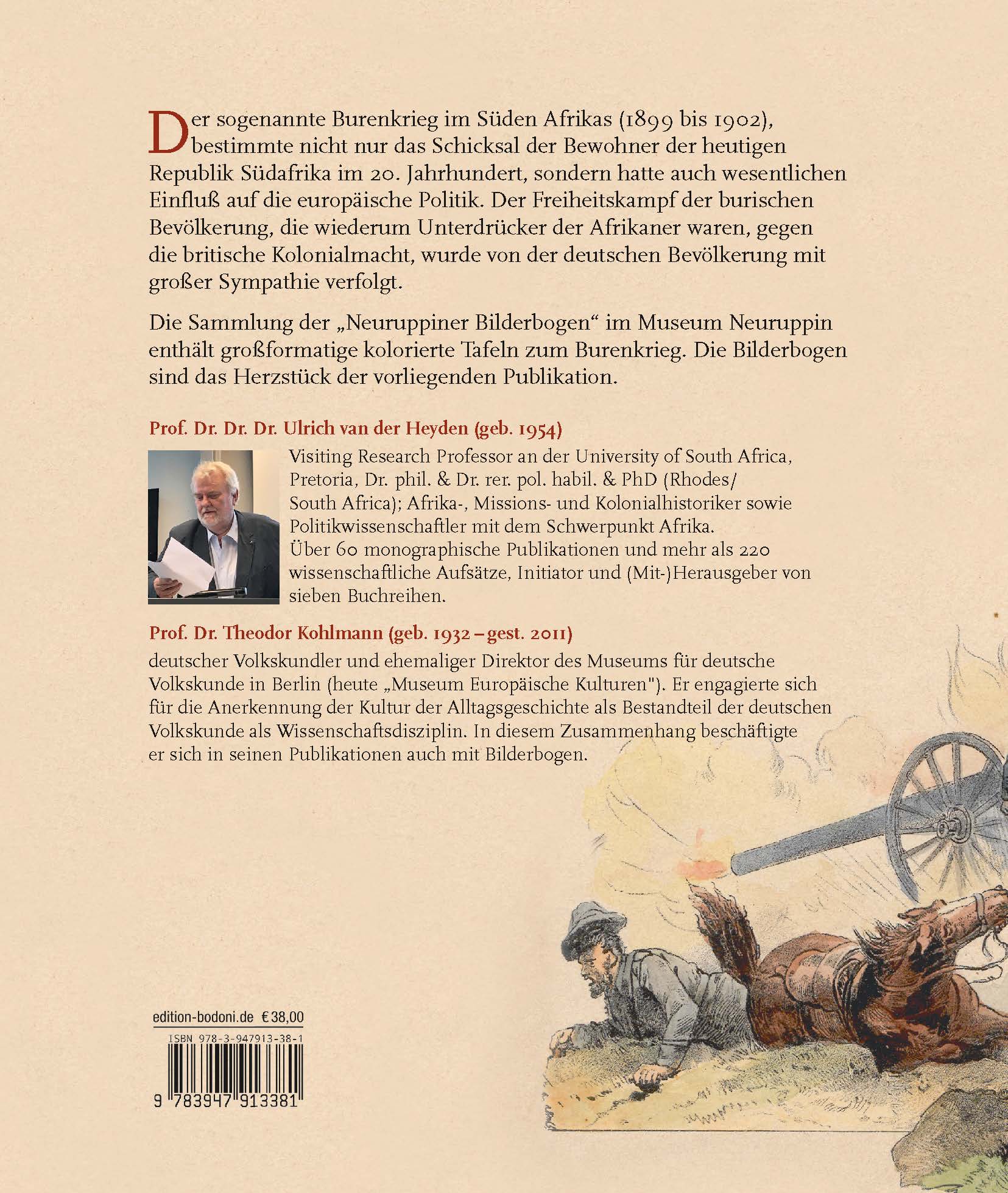 Der sogenannte Burenkrieg im Süden Afrikas (1899 bis 1902), bestimmte nicht nur das Schicksal der Bewohner der heutigenRepublik Südafrika im 20. Jahrhundert, sondern hatte auch wesentlichen Einfluß auf die europäische Politik. Der Freiheitskampf der burischen Bevölkerung, die wiederum Unterdrücker der Afrikaner waren, gegen die britische Kolonialmacht, wurde von der deutschen Bevölkerung mit großer Sympathie verfolgt. Die Sammlung der "Neuruppiner Bilderbogen" im Museum Neuruppin enthält großformatige kolorierte Tafeln zum Burenkrieg. Die Bilderbogen sind das Herzstück der vorliegenden Publikation.