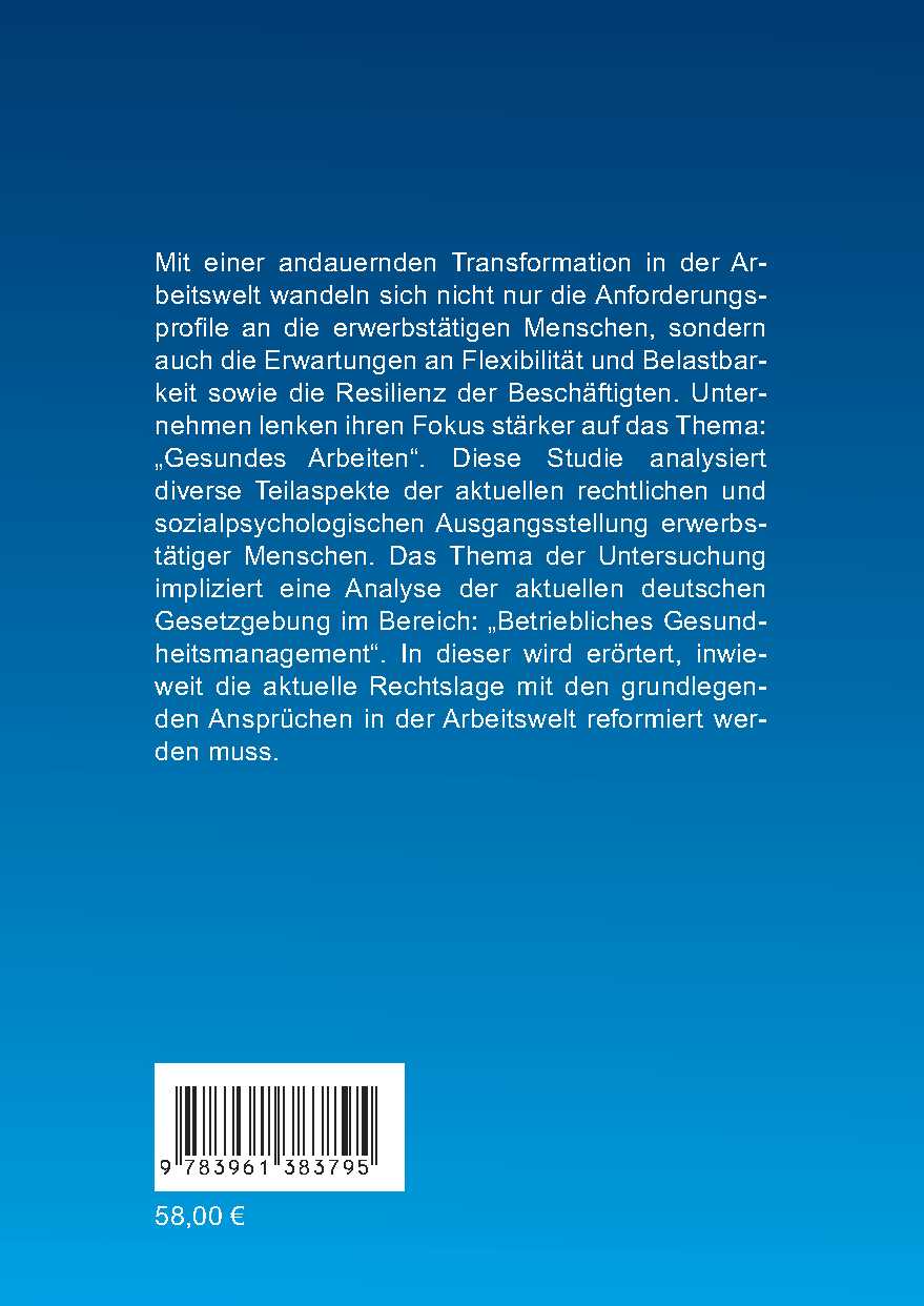 Mit einer andauernden Transformation in der Arbeitswelt wandeln sich nicht nur die Anforderungsprofile an die erwerbstätigen Menschen, sondern auch die Erwartungen an Flexibilität und Belastbarkeit sowie die Resilienz der Beschäftigten. Unternehmen lenken ihren Fokus stärker auf das Thema: „Gesundes Arbeiten“. Diese Studie analysiert diverse Teilaspekte der aktuellen rechtlichen und sozialpsychologischen Ausgangsstellung erwerbstätiger Menschen. Das Thema der Untersuchung impliziert eine Analyse der aktuellen deutschen Gesetzgebung im Bereich: „Betriebliches Gesundheitsmanagement“. In dieser wird erörtert, inwieweit die aktuelle Rechtslage mit den grundlegenden Ansprüchen in der Arbeitswelt reformiert werden muss.