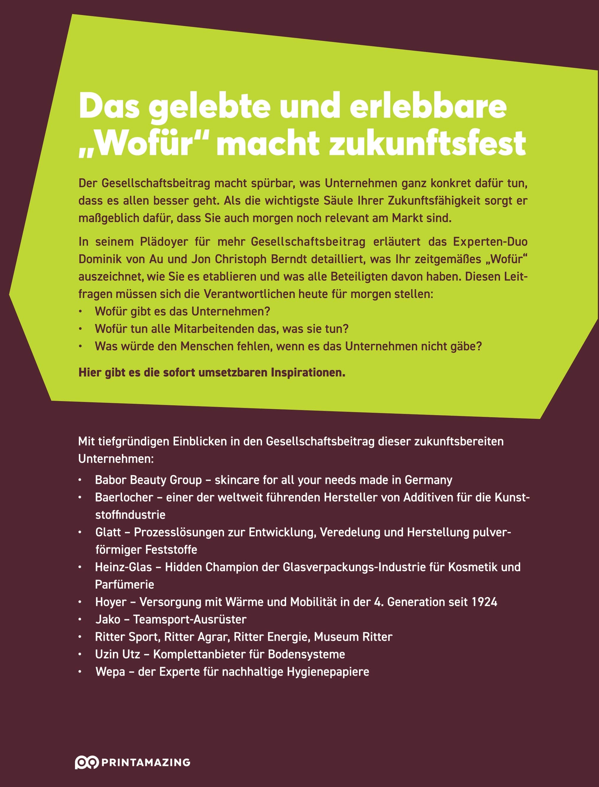 | Schlagworte | Arnold Weissmann • Aufmerksamkeit • Beirat • Beratung • Brand • Brandamazing • Brand Behavior • Brand Behaviour • Branding • Brun-Hagen Hennerkes • Dominik von Au • Employer Branding • Esch • Familienunternehmen • Familienverfassung • Family Governance • Future • Future-Ready • Gesellschaftsbeitrag • Governance • Häusel • Hidden champions • Human Branding • Identität • Illner • Inhaber • Inhaberstrategie • Jon Christoph Berndt • Kommunikation • Marke • Markenbildung • Markenentwicklung • Markenführung • Markenkern • Markenpersönlichkeit • Markenverhalten • Markenwerte • Mission • next gen • Personal Branding • Peter May • Positionierung • Produktmarketing • Profilierung • Purpose • PwC • Schroiff • Simon Sinek • Sinn • Tomczak • Tom Rüsen • Touchpoint • Uwe Rittmann • Vision • Wala • Weissman & Cie. • Werbung • why • Wieselhuber & Partner • Wofür • Zukunft • zukunftsbereit • zukunftsfest • Zweck |
