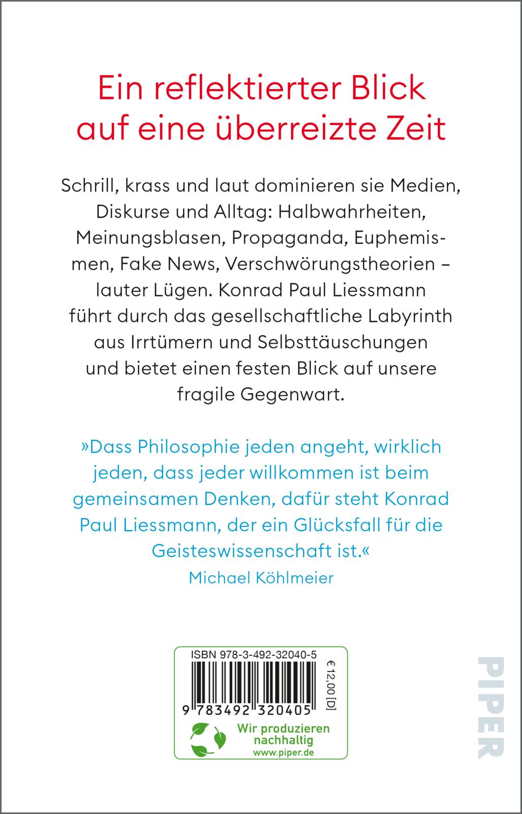 Halbwahrheiten, Meinungsblasen, Propaganda, Euphemismen, Fake News, Verschwörungstheorien - lauter Lügen. Schrill, unüberseh- und unüberhörbar dominieren sie die Medien und die Diskurse. Um in diesem Gewirr und auch abseits davon die Wahrheit zu erhaschen, bedarf es eines scharfen Blicks und Ohrs. Konrad Paul Liessmann seziert die Gegenwart, sowohl aus der Distanz und mit sanfter Ironie als auch engagiert und mit großem Ernst. Pointiert entwirft der Philosoph ein facettenreiches Panorama unserer Gesellschaft und ein Mosaik ihrer Irrtümer und Selbsttäuschungen.