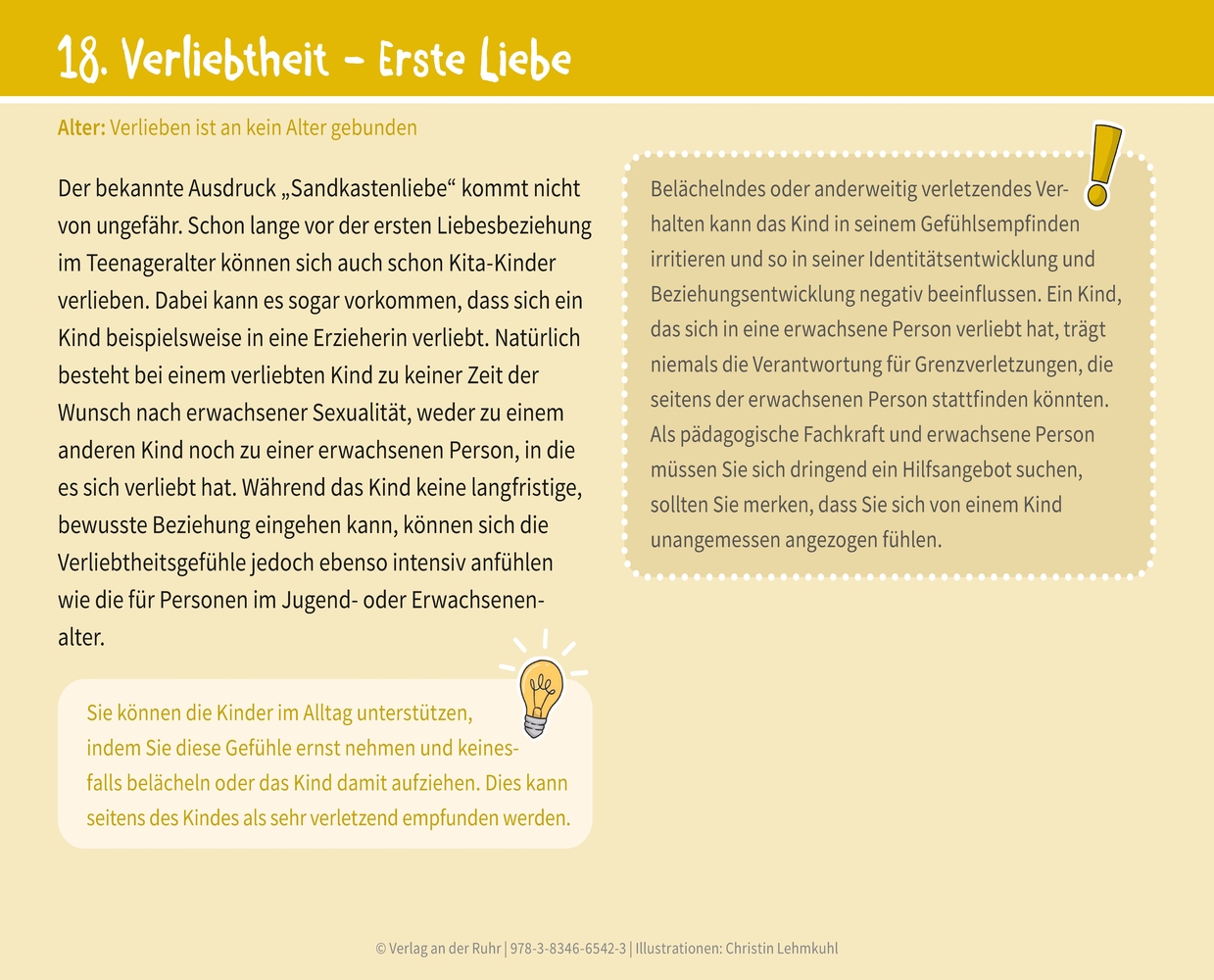 Verständliche Karten zur psychosexuellen Entwicklung von Kita-Kindern! Geeignet für das Kita-Team und die Elternarbeit +++Kindliche Sexualität ist ein natürlicher Meilenstein in der Entwicklung. Sie ist deutlich von erwachsener Sexualität abzugrenzen und bildet gleichzeitig den Grundstein einer selbstbestimmten Sexualität im Erwachsenenalter. Aber was bedeutet psychosexuelle Entwicklung genau, was ist typisches Verhalten, wie dürfen Kinder sich selbst und ihre Körper entdecken und wie geht man mit dem Thema Grenzüberschreitung bei Kindern um? Unser zugängliches Kartenset vermittelt Sicherheit im Umgang mit dem oft noch schambehafteten Thema. Die Karten bilden in den miteinander verbundenen Bereichen Sauberkeitsentwicklung, Identitätsentwicklung (inkl. Diversität und Transidentität), Sensomotorik, Nähe und Distanz (Geschlechtsteile beim Namen kennen; Nein sagen können) sowie Grenzbereiche der Sexualität (Vulgärsprache und Grenzverstöße) typische Situationen im Kita-Alltag ab und geben übersichtliches Hintergrundwissen. Das Downloadmaterial liefert Regeln für Wickelsituationen und genitale Erkundungsspiele zwischen den Kindern.