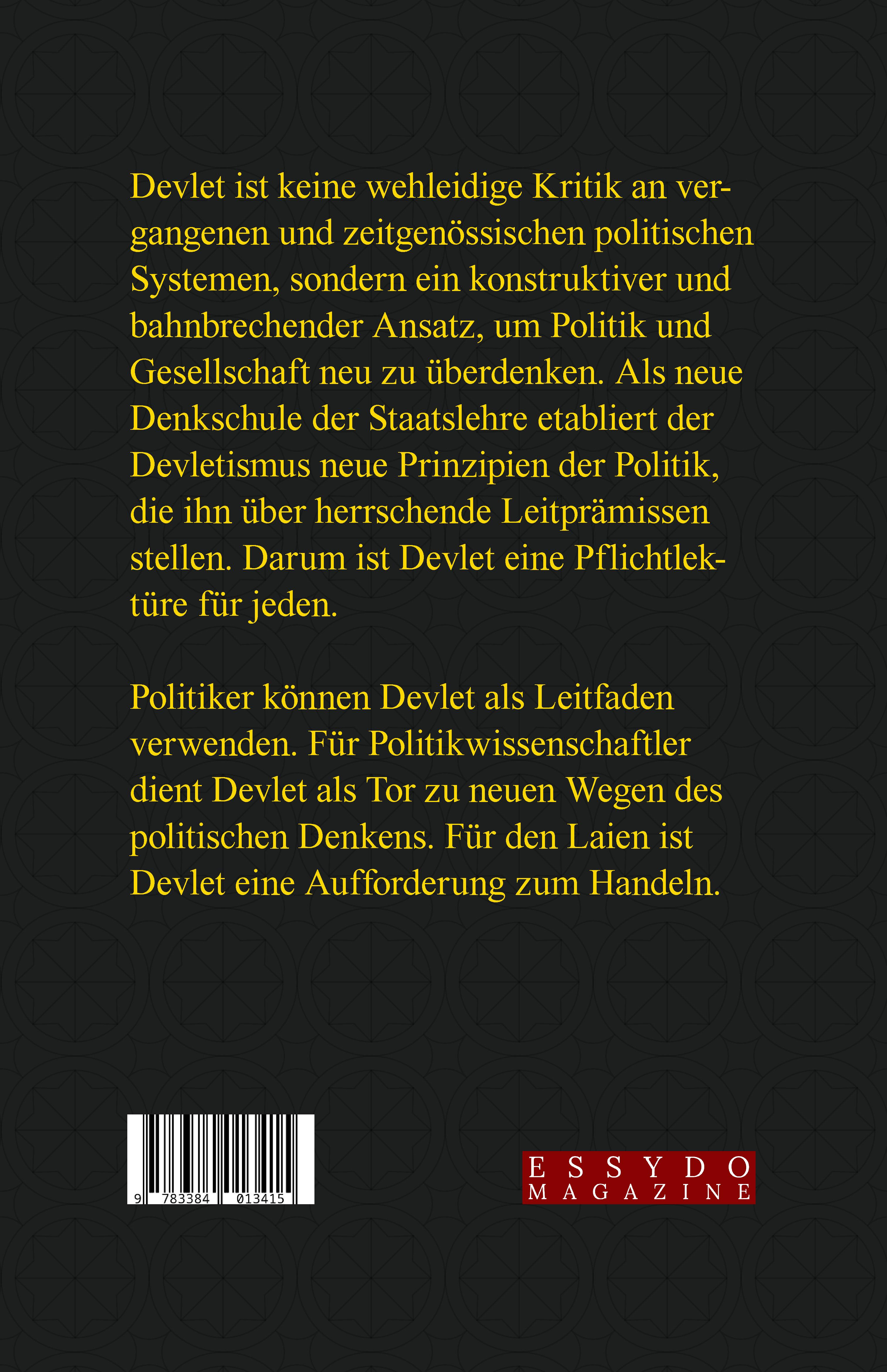 Devlet ist keine wehleidige Kritik an vergangenen und zeitgenössischen politischen Systemen, sondern ein konstruktiver und bahnbrechender Ansatz, um Politik und Gesellschaft neu zu überdenken. Als neue Denkschule der Staatslehre etabliert der Devletismus neue Prinzipien der Politik, die ihn über herrschende Leitprämissen stellen. Darum ist Devlet eine Pflichtlektüre für jeden. Politiker können Devlet als Leitfaden verwenden. Für Politikwissenschaftler dient Devlet als Tor zu neuen Wegen des politischen Denkens. Für den Laien ist Devlet eine Aufforderung zum Handeln.