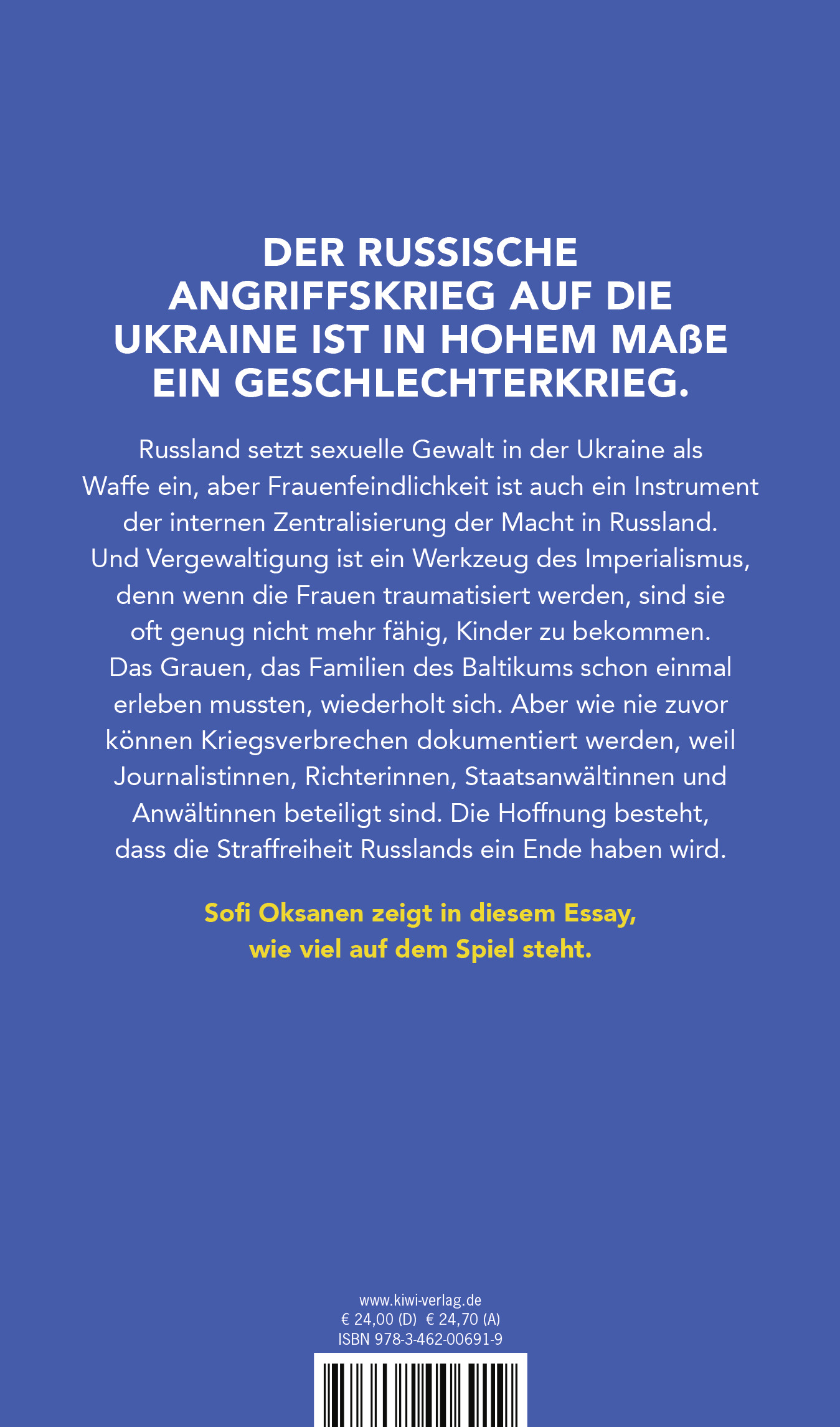 | Schlagworte | Baltikum • Dekolonialismus • Desinformationskampagne • Estnische Geschichte • Feminismus • Finnland • Frauenfeindlichkeit • Geschlechterkampf • Gleichberechtigung • KGB • Kriegsverbrechen • Mutige Bücher • Putin • Putin's War on Women • Russischer Angriffskrieg • Russischer Kolonialismus • Same River, Twice • Sexualisierte Gewalt • Sexuelle Gewalt • Sofi Oksanen • Sowjetunion • Ukraine-Krieg |