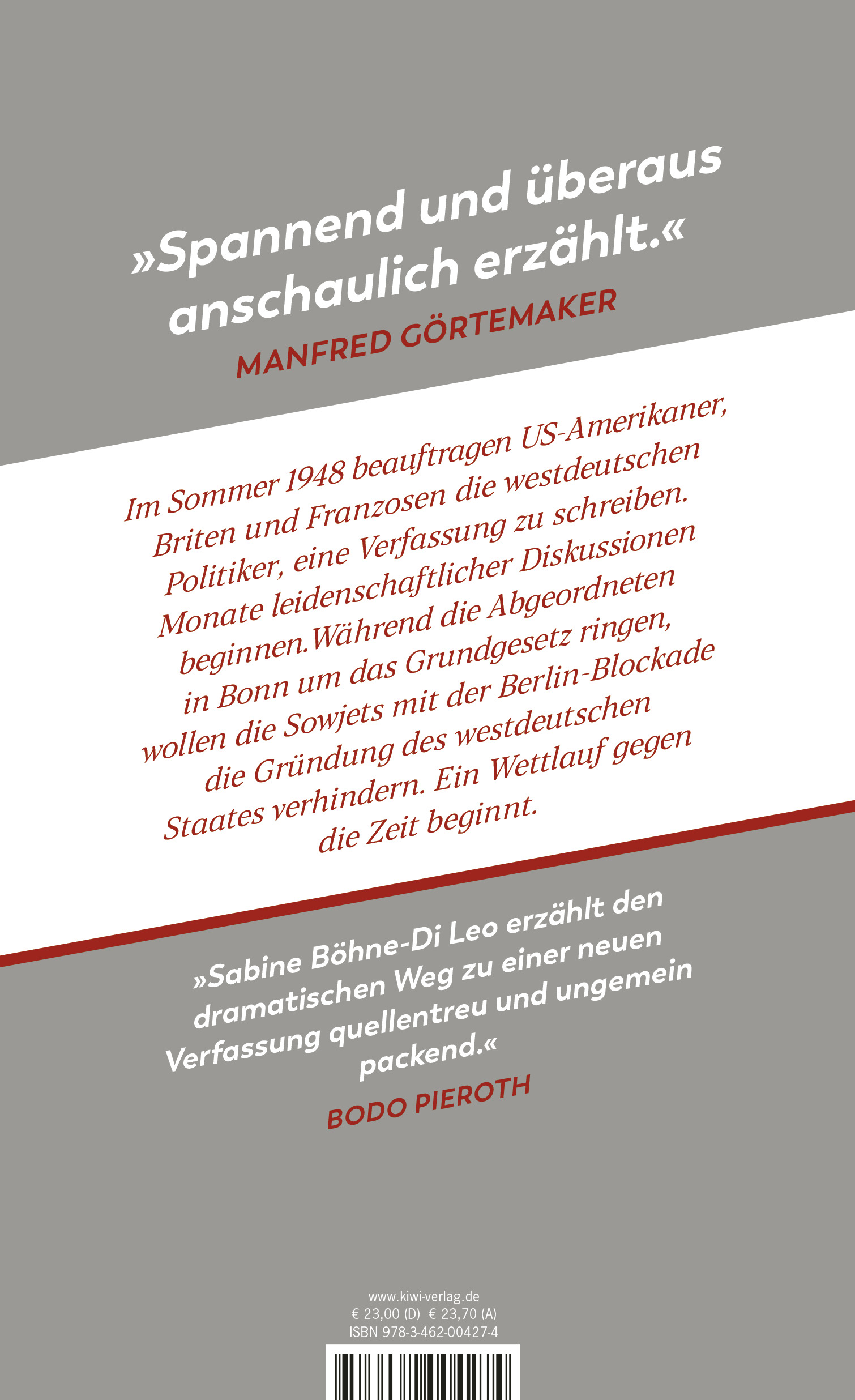 Sabine Böhne-Di Leo nimmt uns mit auf eine faszinierende Zeitreise ins Jahr 1948/49. Sie schildert lebendig den Alltag zwischen Trümmern und Kartoffeläckern, analysiert die Interessen der Weltmächte und erzählt, auch auf der Basis von Archivfunden, wie das Recht auf Meinungsfreiheit oder auf Asyl den Weg ins Grundgesetz fand – und warum die Gleichberechtigung von Männern und Frauen erst in letzter Sekunde aufgenommen wurde.