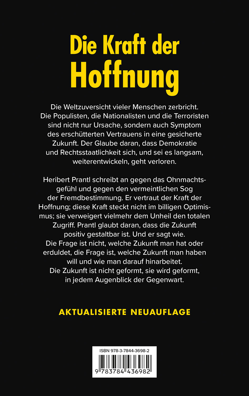 Die Weltzuversicht vieler Menschen zerbricht. Die Populisten, die Nationalisten und die Terroristen sind nicht nur Ursache, sondern auch Symptom des erschütterten Vertrauens in eine gesicherte Zukunft. Der Glaube daran, dass Demokratie und Rechtstaatlichkeit sich, und sei es langsam, weiterentwickeln, geht verloren. Heribert Prantl schreibt an gegen das Ohnmachtsgefühl und gegen den vermeintlichen Sog der Fremdbestimmung. Er vertraut der Kraft der Hoffnung; diese Kraft steckt nicht im billigen Optimismus; sie verweigert vielmehr dem Unheil den totalen Zugriff. Prantl glaubt daran, dass die Zukunft positiv gestaltbar ist. Und er sagt wie. Die Frage ist nicht, welche Zukunft man hat oder erduldet, die Frage ist, welche Zukunft man haben will und wie man darauf hinarbeitet. Die Zukunft ist nicht geformt, sie wird geformt, in jedem Augenblick der Gegenwart.