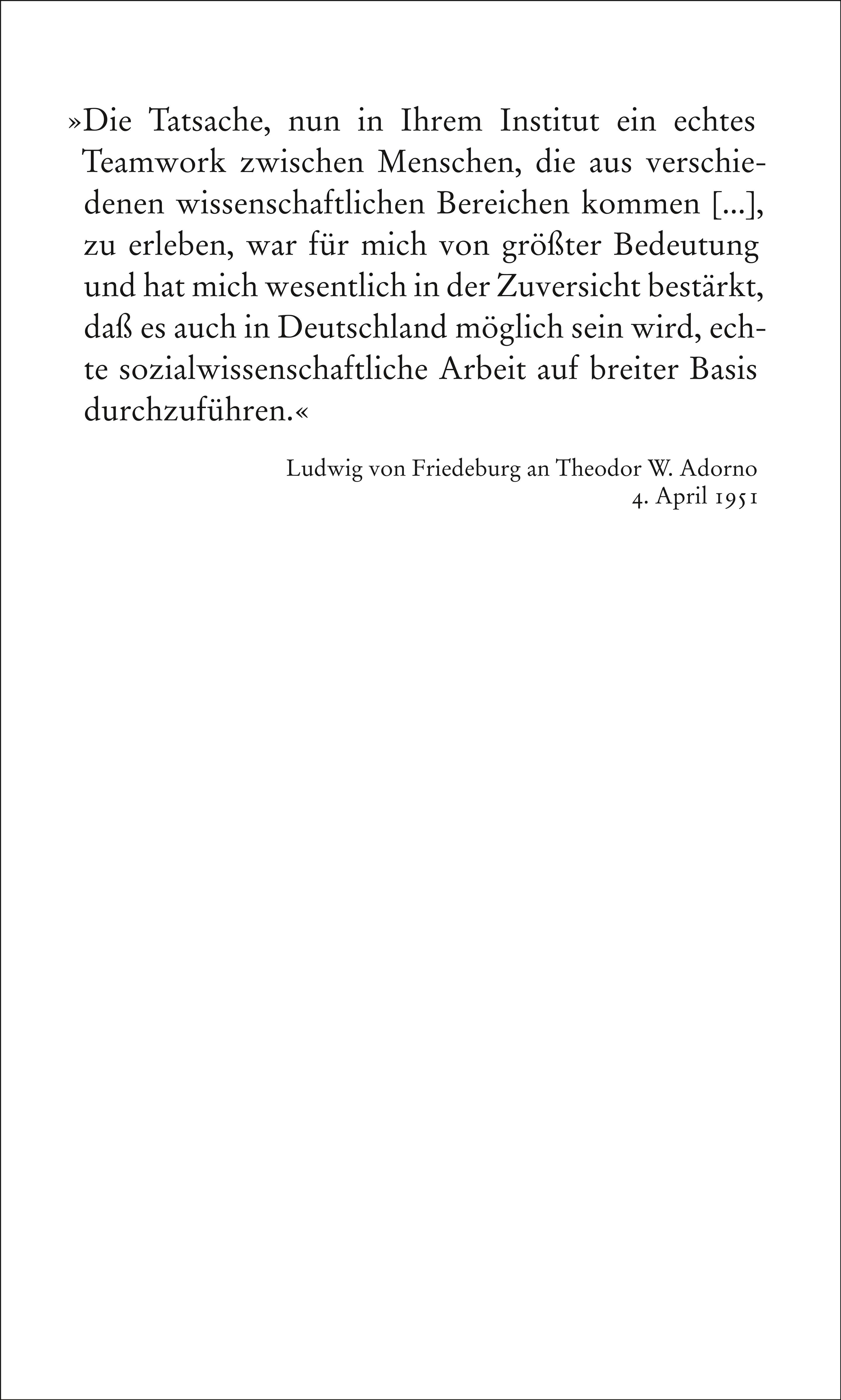 Unmittelbar nach der Rückkehr des Instituts für Sozialforschung aus dem US-amerikanischen Exil nach Frankfurt bewarb sich ein junger Student bei Theodor W. Adorno um Mitarbeit: Ludwig von Friedeburg, Sohn des letzten Oberbefehlshabers der deutschen Kriegsmarine und selbst deren jüngster U-Boot-Kommandant im Zweiten Weltkrieg. Das erste gemeinsame Projekt war das berühmte »Gruppenexperiment«, jene von den US-Besatzungsbehörden finanzierte Studie, mit der die Demokratiefähigkeit der deutschen Bevölkerung nach NS-Diktatur, Vernichtungskrieg und Völkermord ermittelt werden sollte. Nach Abschluss des Vorhabens schrieb von Friedeburg begeistert von dem »ganz besonderen Geist« des Instituts für Sozialforschung und von der »geradezu beispielhaften Art des Teamworks in ihm«.