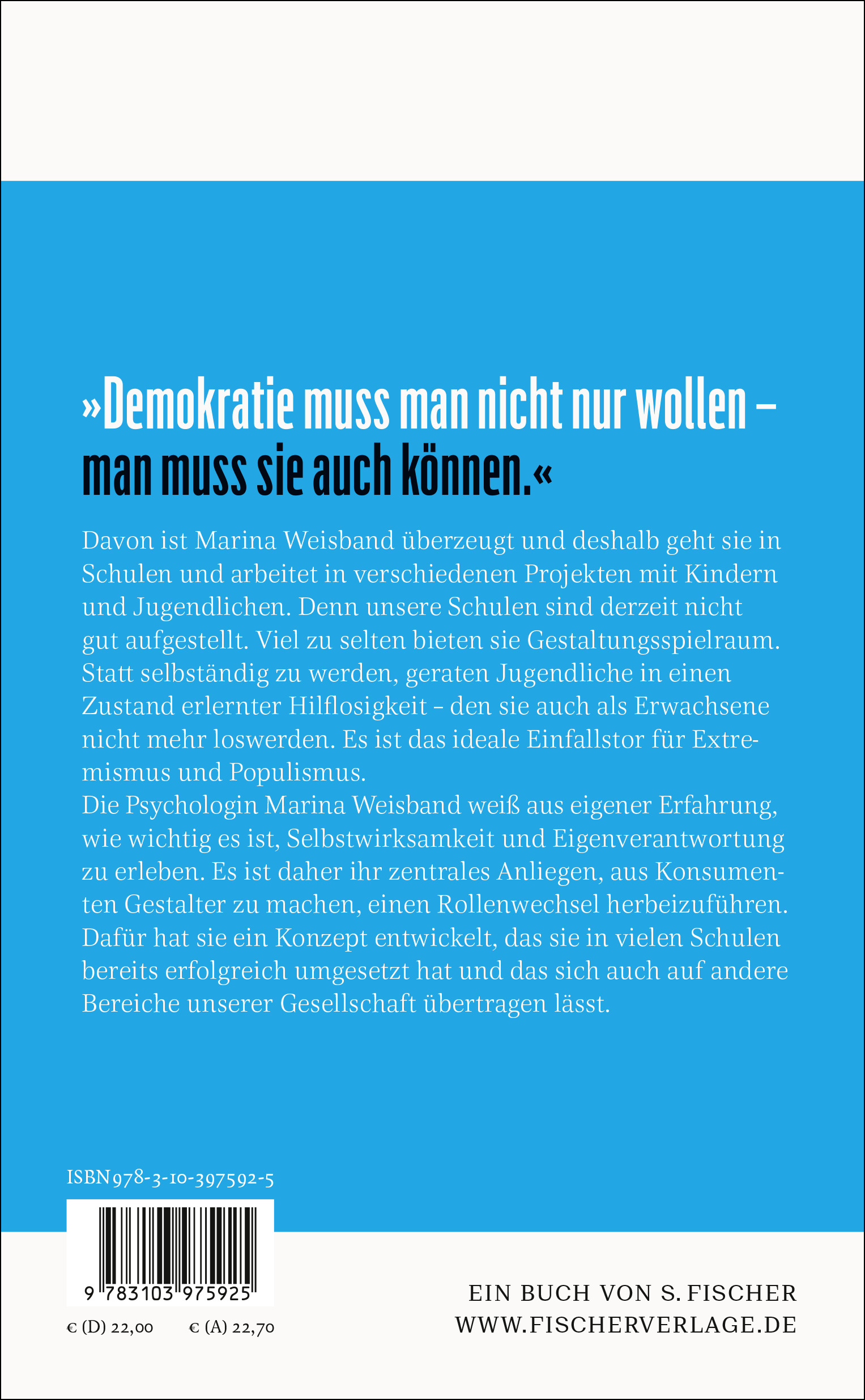 Die Psychologin Marina Weisband ist davon überzeugt, dass Demokratie gelernt werden muss. Sie nur zu wollen, reicht definitiv nicht aus. Mit Demokratieförderung kann gar nicht früh genug begonnen werden, deshalb geht Marina Weisband in Schulen und arbeitet in verschiedenen Projekten mit Kindern und Jugendlichen. Denn unsere Schulen sind derzeit nicht gut aufgestellt. Viel zu selten bieten sie Gestaltungsspielraum. Statt selbständig zu werden, geraten Jugendliche in einen Zustand erlernter Hilflosigkeit – den sie auch als Erwachsene nicht mehr loswerden. Das wiederum ist ein ideales Einfallstor für Extremismus und Populismus.