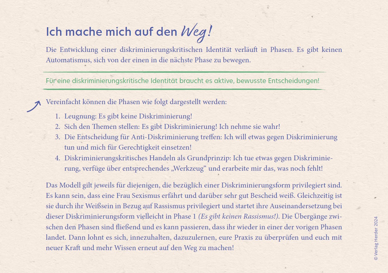 | Schlagworte | Anti-Bias • Antidiskriminierung • Diversität • Diversitätssensible Pädagogik • Erzieherin • Inklusion • Inklusive Haltung • Pädagogische Fachkraft • Pädagogischer Ansatz • Vorurteilsbewusste Bildung • vorurteilsbewusste Erziehung • Vorurteilsbewusste Pädagogik |