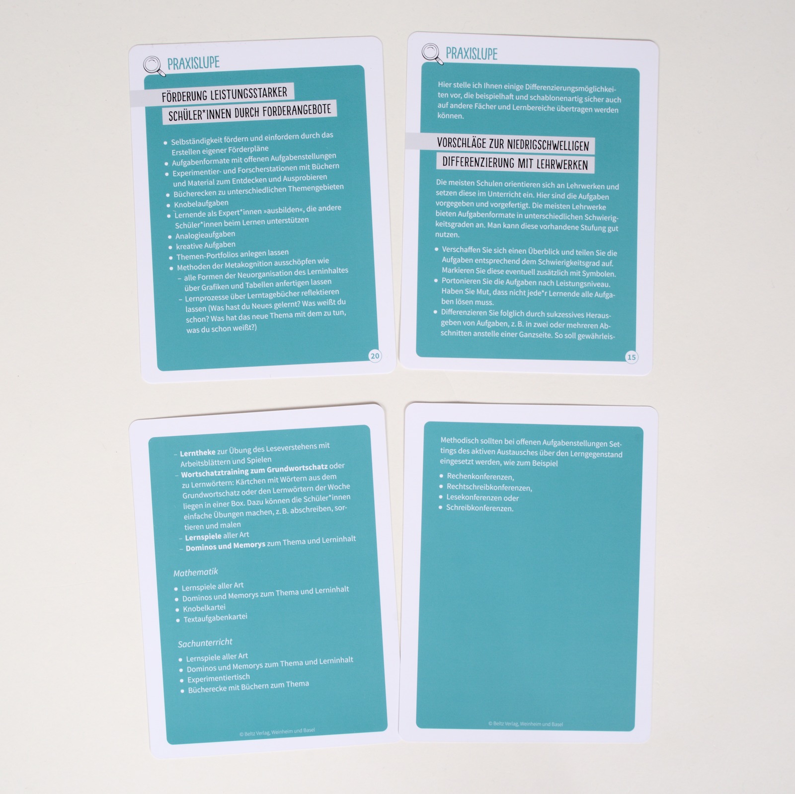 Differenzierung ernst zu nehmen verändert die Unterrichtsgestaltung grundlegend. Die Umsetzung wird daher von Lehrkräften häufig mit aufwändiger Organisation und hohem Materialaufwand gleichgesetzt. Auch Unbehagen oder vielleicht sogar Ängste werden oft geäußert. Angesichts dieser Bedenken möchte das Kartenset Mut machen, Differenzierung durchgängig in den Unterrichtsalltag einzubeziehen, indem es praxisnah aufzeigt, was Differenzierung im Deutschunterricht meint und wie Lehrkräfte dabei am besten vorgehen können. Damit wird das Set zum hilfreichen Begleiter für eine individualisierte Unterrichtspraxis, die Heterogenität positiv begegnen möchte.