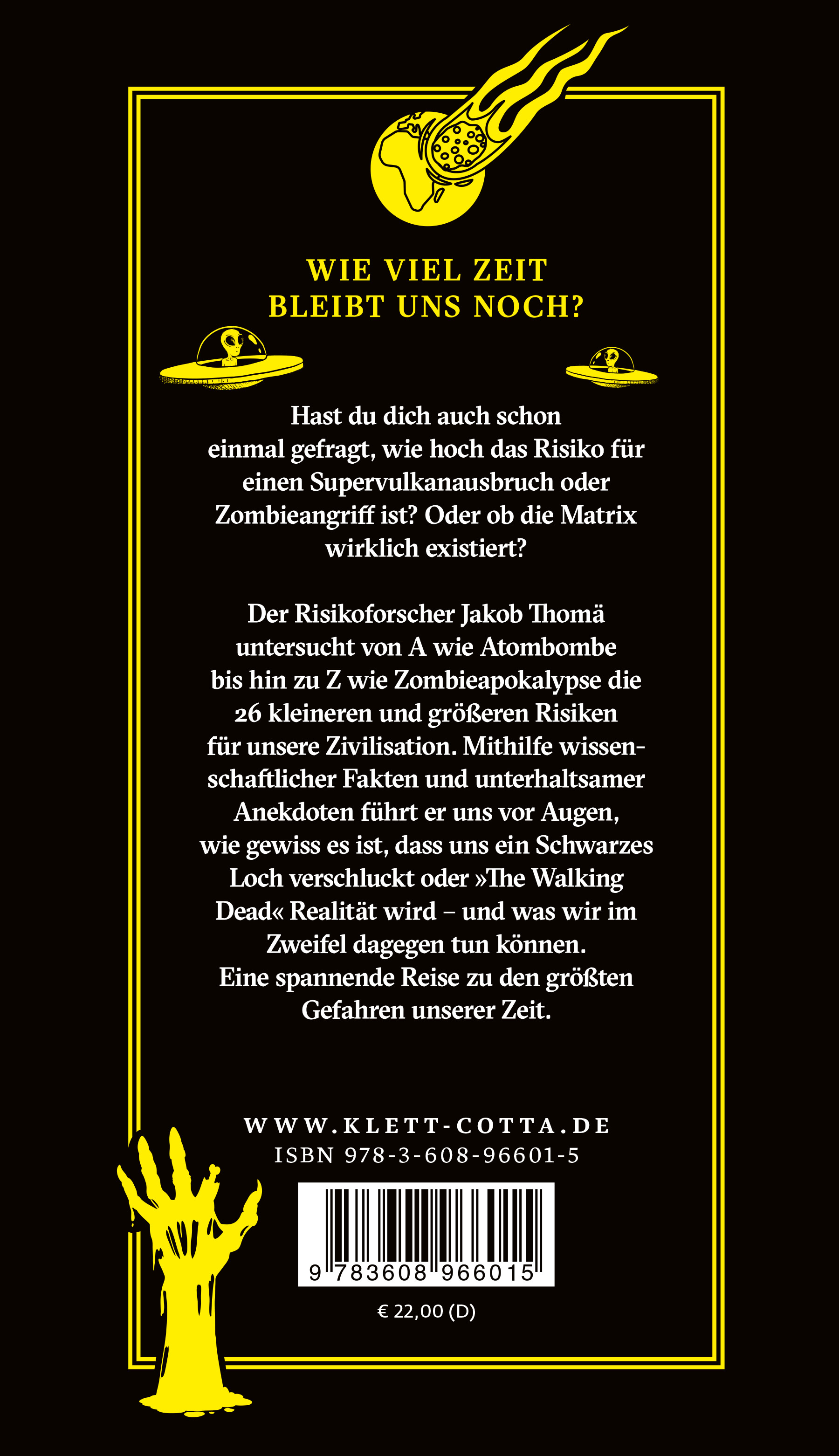 Haben Sie sich auch schon einmal gefragt, wie hoch die Wahrscheinlichkeit ist, dass Außerirdische die Erde angreifen? Wie groß das Risiko für einen Asteroideneinschlag oder Supervulkanausbruch ist? Oder ob die Matrix wirklich existiert? Täglich hören wir von diesen möglichen Ereignissen und ihren Folgen. In seinem neuen Werk untersucht Jakob Thomä von A wie Atombombe bis hin zu Z wie Zombieapokalypse die 26 kleineren und größeren Risiken für unsere Zivilisation. Mithilfe wissenschaftlicher Fakten und unterhaltsamer Anekdoten führt er uns vor Augen, wie gewiss es ist, dass uns ein Schwarzes Loch verschluckt oder »The Walking Dead« Realität wird – und was wir im Zweifel dagegen tun können. Humorvoll, aufschlussreich und dazu charmant illustriert.