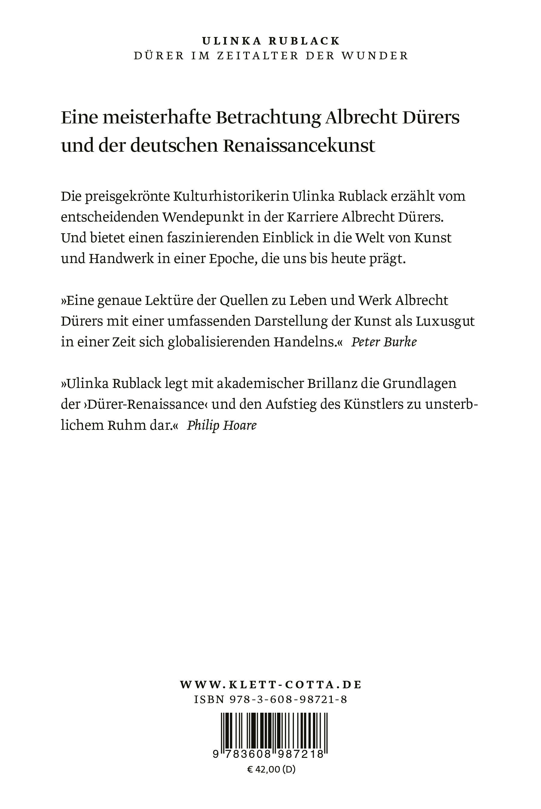 Die preisgekrönte Kulturhistorikerin Ulinka Rublack erzählt vom entscheidenden Wendepunkt in der Karriere Albrecht Dürers. Und bietet einen faszinierendern Einblick in die Welt von Kunst und Handwerk in einer Epoche, die uns bis heute prägt.