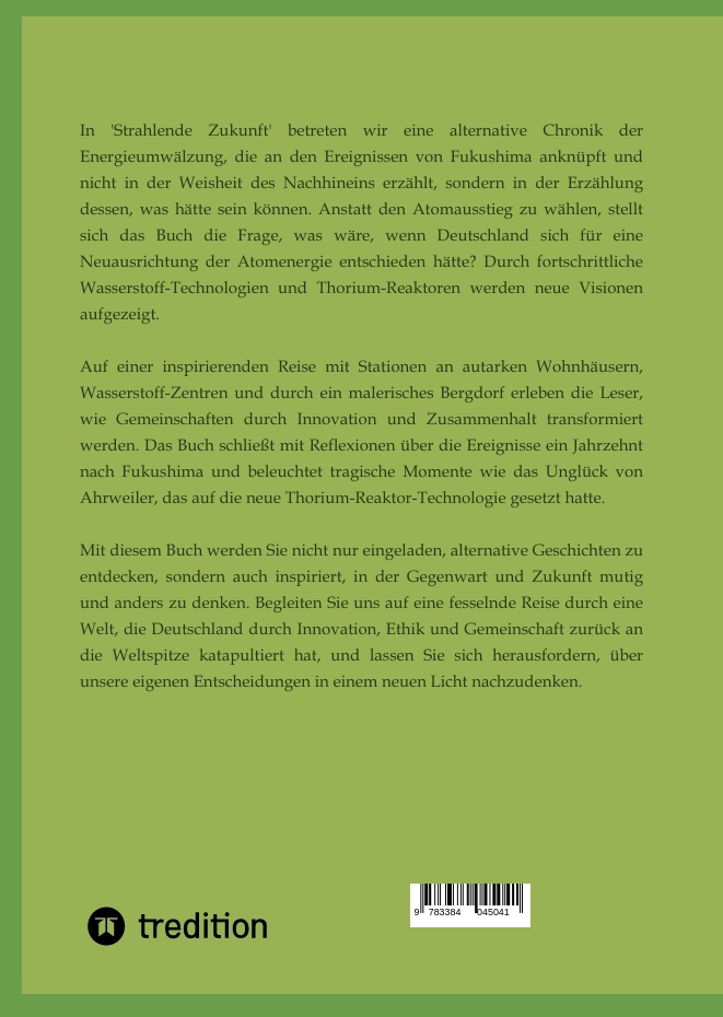 | Schlagworte | Alternative Energiezukunft • Atomausstieg-Debatte • Bildung und Diskurs • Ethik und Nachhaltigkeit • Extremismus und Gesellschaft • gesellschaftliche Reflexion • Globaler Energiekurswechsel • Globaler industrieller Wettbewerb • Herausforderungen und Lösungen • Industrieller Vorsprung • Inspirierende Szenarien • MINT-Berufe und Bildung • Mutige Entscheidungen • Politische Wendepunkte • Reise in die Möglichkeiten • technologische Innovationen • Thorium-Reaktoren • Visionäres Deutschland • Wasserstoffrevolution • Zukunftsorientierter Diskurs |