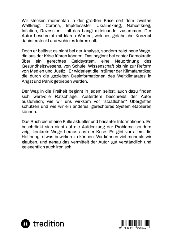 Wir stecken momentan in der größten Krise seit dem zweiten Weltkrieg: Corona, Impfdesaster, Ukrainekrieg, Nahostkrieg, Inflation, Rezession - all das hängt miteinander zusammen. Der Autor beschreibt mit klaren Worten, welches gefährliche Konzept dahintersteckt und wohin es führen soll. Doch er belässt es nicht bei der Analyse, sondern zeigt neue Wege, die aus der Krise führen können. Das beginnt bei echter Demokratie über ein gerechtes Geldsystem, eine Neuordnung des Gesundheitswesens, von Schule, Wissenschaft bis hin zur Reform von Medien und Justiz. Er widerlegt die Irrtümer der Klimafanatiker, die durch die gezielten Desinformationen des Weltklimarates in Angst und Panik getrieben werden. Der Weg in die Freiheit beginnt in jedem selbst, auch dazu finden sich wertvolle Ratschläge. Außerdem beschreibt der Autor ausführlich, wie wir uns wirksam vor "staatlichen" Übergriffen schützen und wie wir ein anderes, gerechteres System etablieren können. Das Buch bietet eine Fülle aktueller und brisanter Informationen. Es beschränkt sich nicht auf die Aufdeckung der Probleme sondern zeigt konkrete Wege heraus aus der Krise. Es gibt vor allem die Hoffnung, etwas bewirken zu können. Wir können viel mehr als wir glauben, und genau das vermittelt der Autor, gut verständlich und gelegentlich auch ironisch.