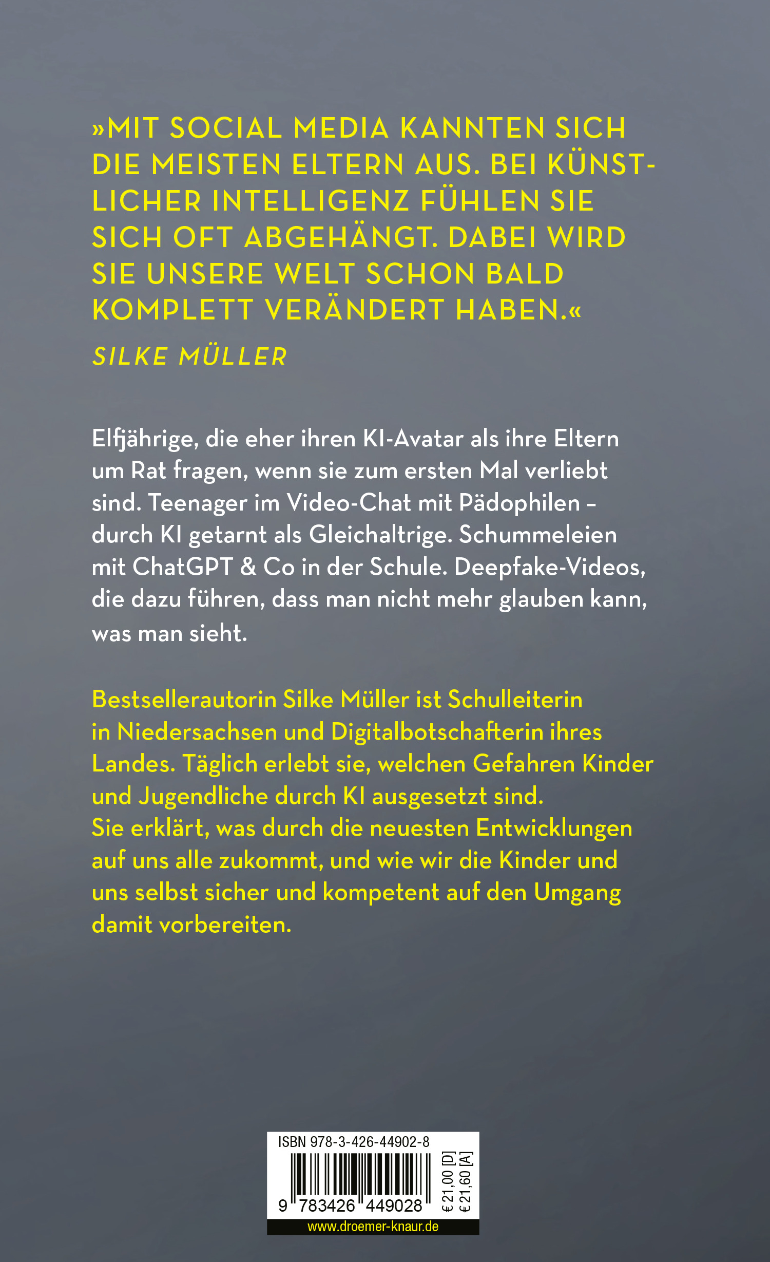 Silke Müller ist Schulleiterin in Niedersachsen und Digital-Beauftragte ihres Landes. Täglich erlebt sie, welchen Gefahren Kinder und Jugendliche durch KI ausgesetzt sind. Für die meisten Eltern, Großeltern und Pädagog*innen hingegen ist künstliche Intelligenz Neuland. Die Gefahren, die von ihr ausgehen, sind den wenigsten in vollem Ausmaß bekannt. Silke Müller hat bereits in ihrem Nummer-1-Bestseller »Wir verlieren unsere Kinder« auf die Gefahren in sozialen Netzwerken hingewiesen. Jetzt widmet sich dem wichtigsten Thema digitaler Bildung: KI. Sie erklärt, was durch die neuesten Entwicklungen auf Eltern und Familien zukommt, und wie wir Kinder und Jugendliche sicher und kompetent daran teilhaben lassen können.