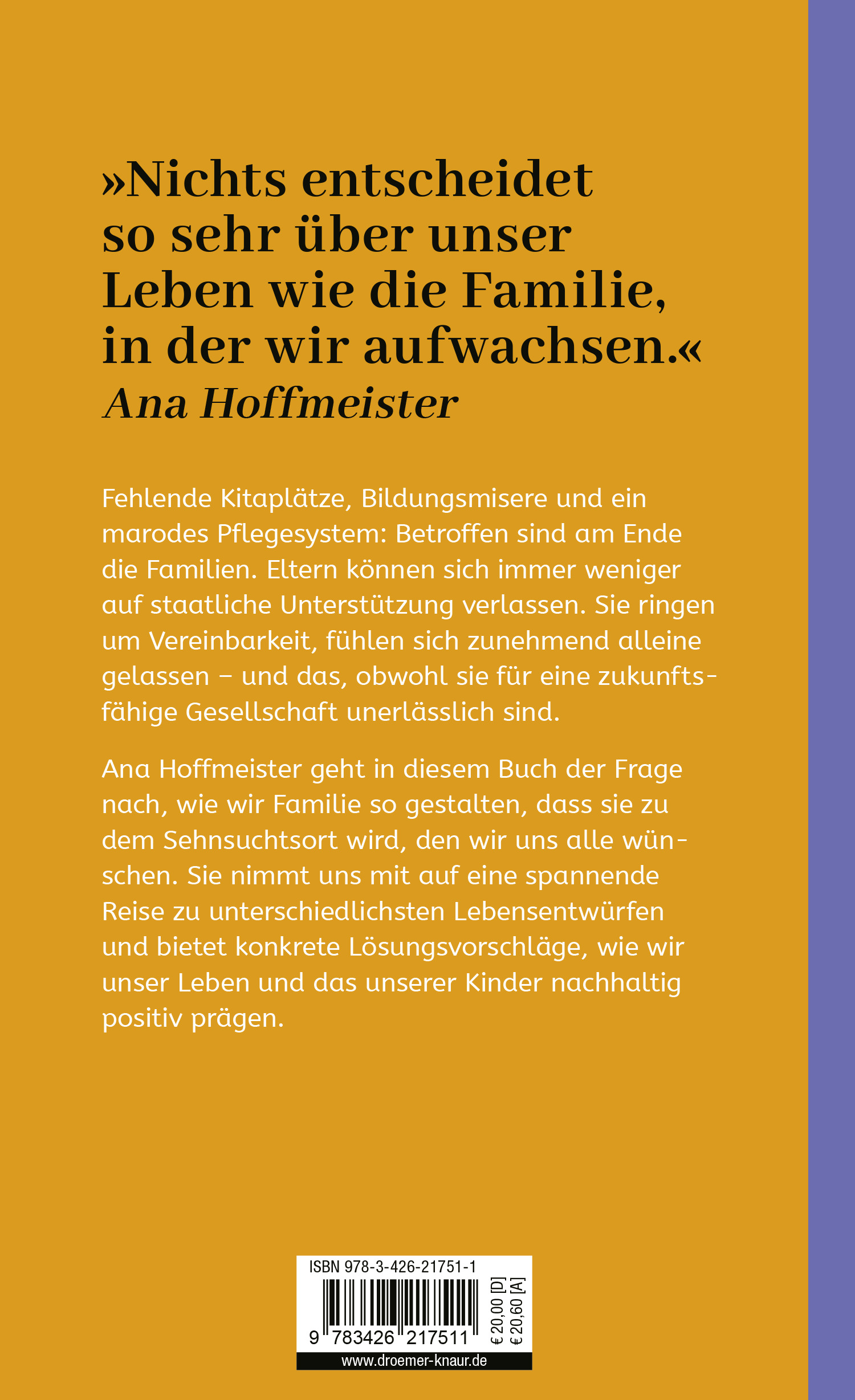 Ana Hoffmeister, zweifache Mutter, Unternehmensberaterin, Speakerin und Podcasterin, wirft in diesem Buch die Frage auf, wie Familie neu gedacht und gelebt werden kann – um die jetzigen und zukünftigen Anforderungen zu stemmen. Sie nimmt uns mit auf eine spannende Reise zu unterschiedlichsten Wohn- und Lebensmodellen – von getrennten, alleinerziehenden oder pflegenden Eltern, über doppelt Vollzeitarbeitende bis hin zu Familien in Mehrgenerationenhäusern – und bietet konkrete Lösungsvorschläge, wie wir Familie so gestalten können, dass sie das Leben unserer Kinder nachhaltig positiv prägt.