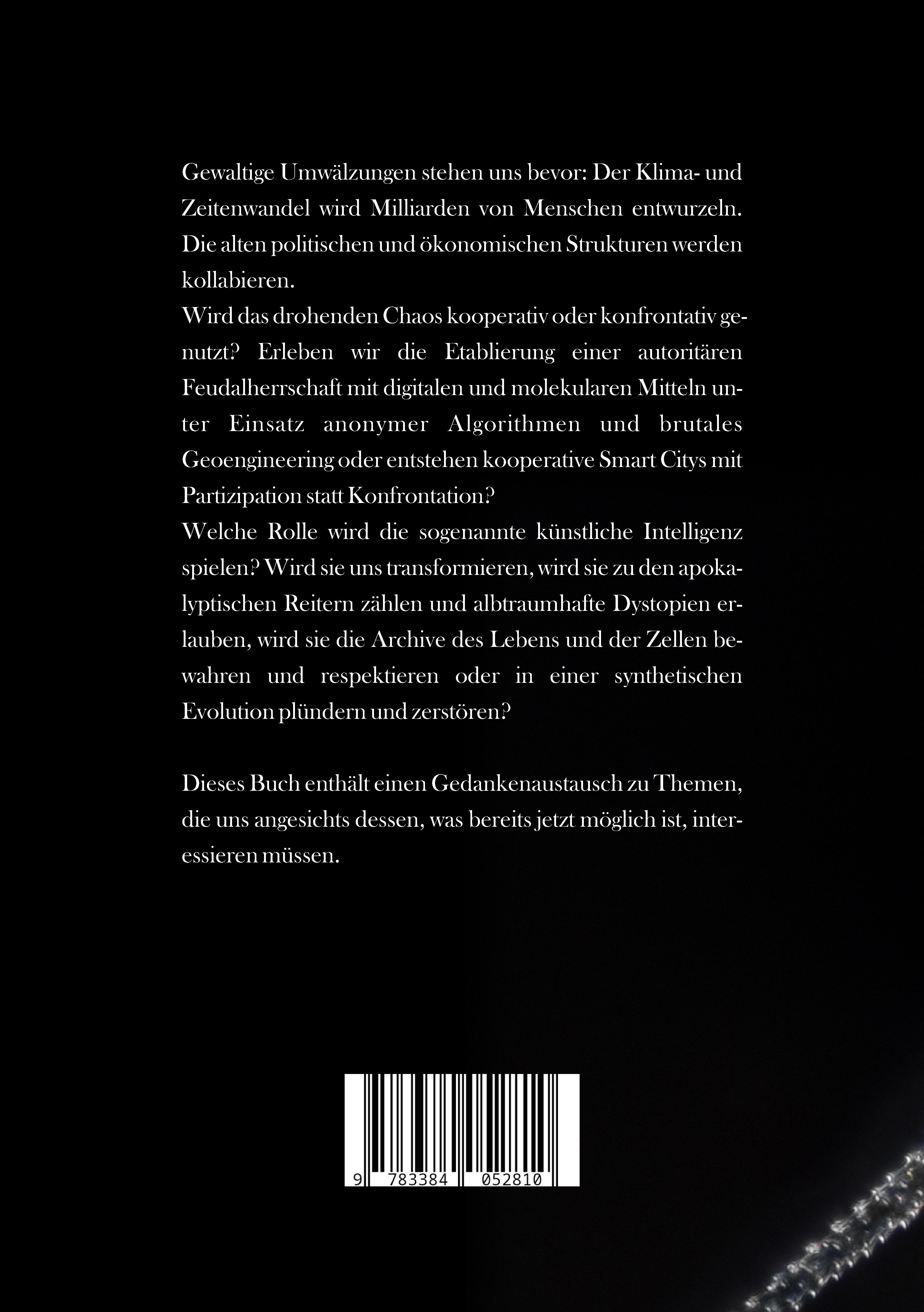 Gewaltige Umwälzungen stehen uns bevor: Der Klima- und Zeitenwandel wird Milliarden von Menschen entwurzeln. Die alten politischen und ökonomischen Strukturen werden kollabieren. Wird das drohenden Chaos kooperativ oder konfrontativ genutzt? Erleben wir die Etablierung einer autoritären Feudalherrschaft mit digitalen und molekularen Mitteln unter Einsatz anonymer Algorithmen und brutales Geoengineering oder entstehen kooperative Smart Citys mit Partizipation statt Konfrontation? Welche Rolle wird die sogenannte künstliche Intelligenz spielen? Wird sie uns transformieren, wird sie zu den apokalyptischen Reitern zählen und albtraumhafte Dystopien erlauben, wird sie die Archive des Lebens und der Zellen bewahren und respektieren oder in einer synthetischen Evolution plündern und zerstören? Dieses Buch enthält einen Gedankenaustausch zu Themen, die uns angesichts dessen, was bereits jetzt möglich ist, interessieren müssen.