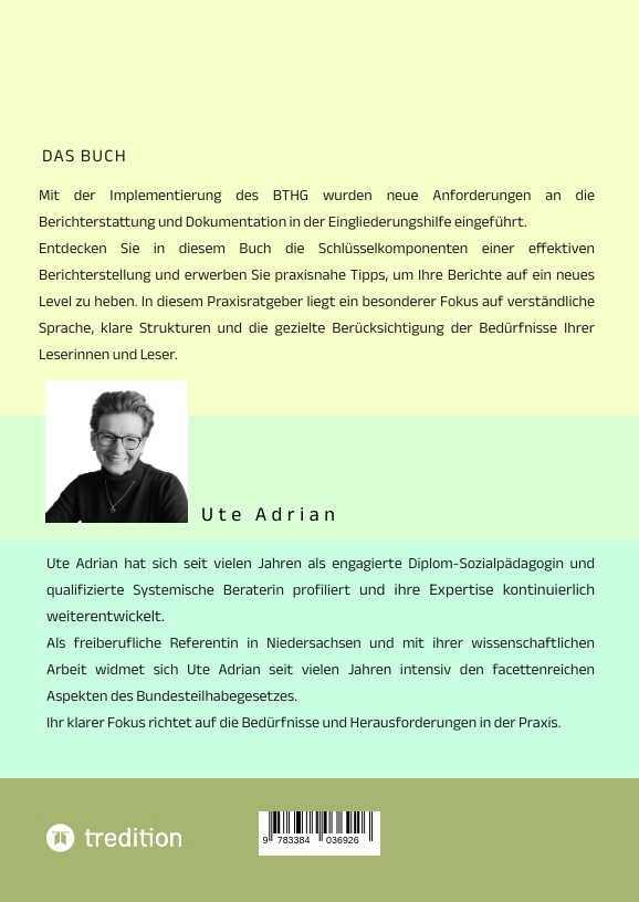 Ute Adrian blickt auf eine beeindruckende berufliche Laufbahn von fast zwei Jahrzehnten in der Psychiatrie zurück, in der sie sich als engagierte Diplom-Sozialpädagogin und qualifizierte Systemische Beraterin profiliert hat. Als Abteilungsleiterin der Eingliederungshilfe bei der renommierten Stiftung 'Die Brücke‘ in Uelzen trägt sie maßgeblich dazu bei, den erfolgreichen Umsetzungsprozess des neuen Teilhaberechts zu gestalten. Als freiberufliche Referentin in Niedersachsen widmet sich Ute Adrian seit vielen Jahren intensiv den facettenreichen Aspekten des Bundesteilhabegesetzes. Ihre Expertise erstreckt sich insbesondere auf die Veränderungen durch das Bundesteilhabegesetz und der Einführung einer neuen gemeinsame Sprache im Rehabilitationsprozess, die einen bedeutenden Fortschritt in der Zusammenarbeit und Verständigung in diesem Bereich darstellt. Mit ihrer wissenschaftlichen Arbeit im Social Management legt sie einen klaren Fokus auf die Bedürfnisse und Herausforderungen in der Praxis. Ute Adrian bringt ihre langjährige Erfahrung und ihr tiefes Verständnis für die Veränderungen im Bereich der Leistungserbringung und durch das BTHG in ihr Buchprojekt ein. Ihr Werk verspricht, einen praxisorientierten und fundierten Beitrag zur aktuellen Diskussion in der Sozialarbeit zu liefern.