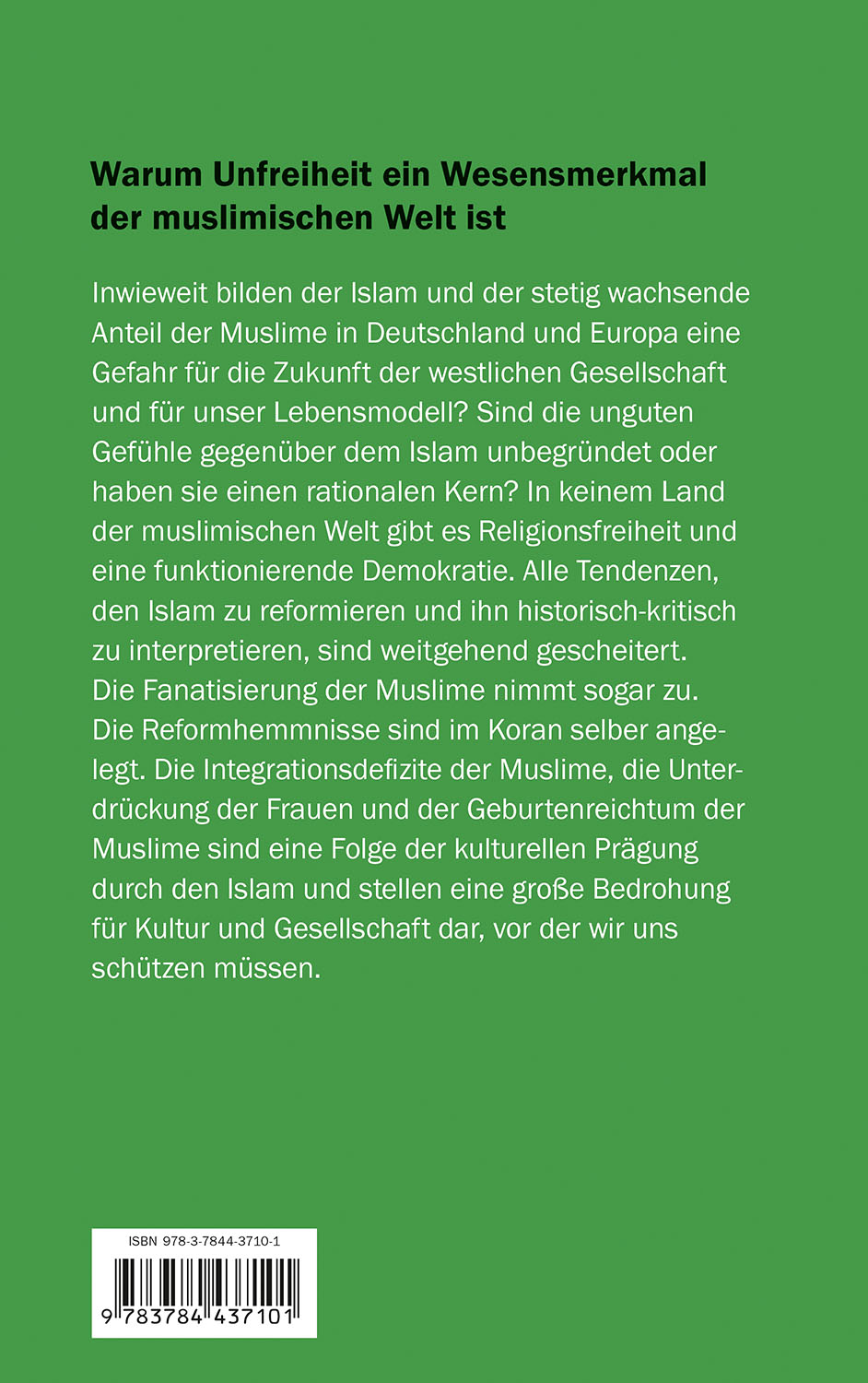 Inwieweit bilden der Islam und der stetig wachsende Anteil der Muslime in Deutschland und Europa eine Gefahr für die Zukunft der westlichen Gesellschaft? Sind die unguten Gefühle gegenüber dem Islam unbegründet oder haben sie einen rationalen Kern? In keinem Land der muslimischen Welt gibt es Religionsfreiheit und eine funktionierende Demokratie. Alle Tendenzen, den Islam zu reformieren und ihn historisch-kritisch zu interpretieren, sind weitgehend gescheitert. Die Fanatisierung der Muslime nimmt sogar zu. Die Reformhemmnisse sind im Koran selbst angelegt. Die Integrationsdefizite der Muslime, die Unterdrückung der Frauen und der Geburtenreichtum der Muslime sind eine Folge der kulturellen Prägung durch den Islam und stellen eine große Bedrohung für Kultur und Gesellschaft dar, vor der wir uns schützen müssen.