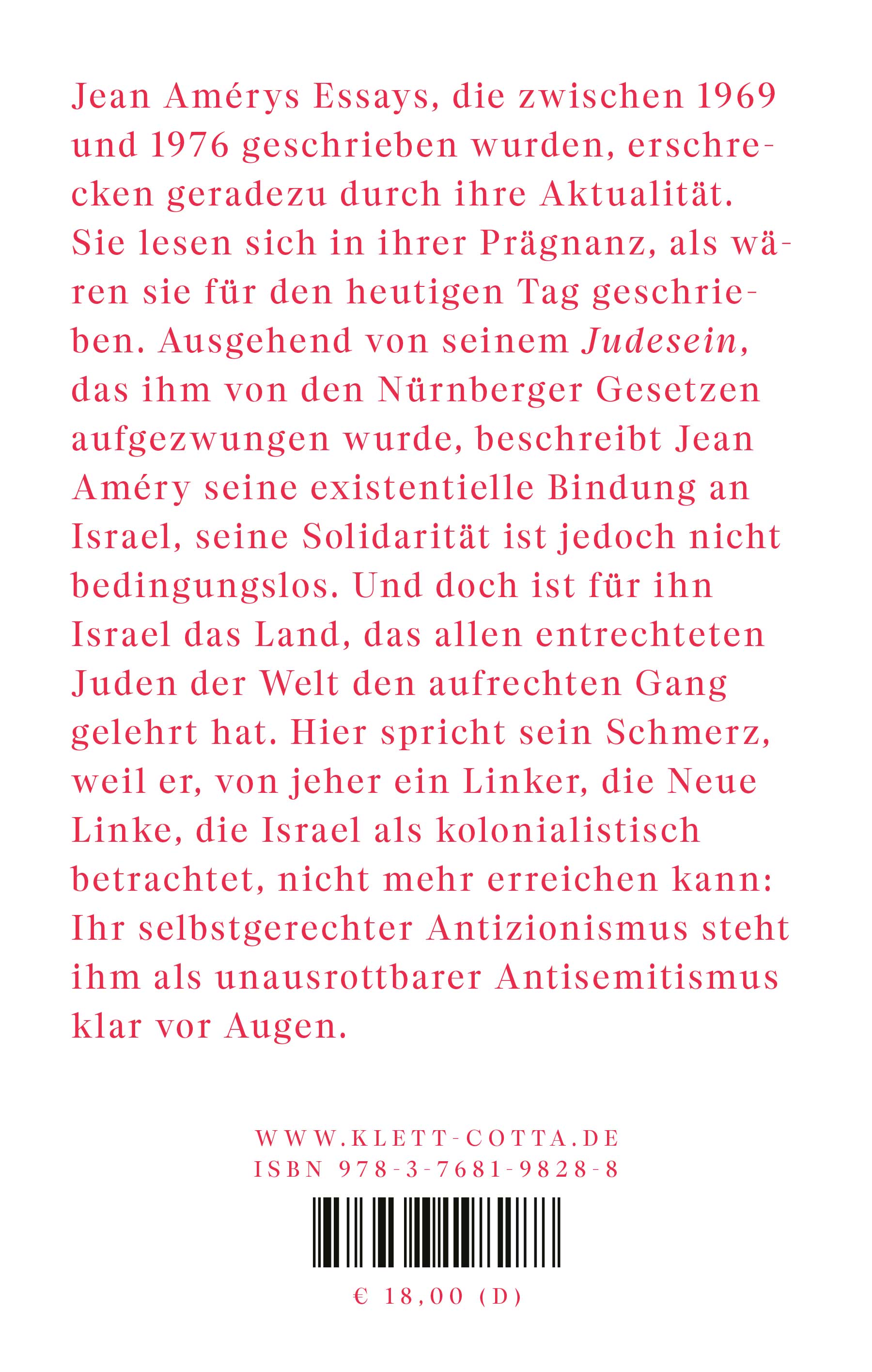 Jean Amérys Essays, die zwischen 1969 und 1976 geschrieben wurden, erschrecken geradezu durch ihre Aktualität. Sie lesen sich in ihrer Prägnanz, als wären sie für den heutigen Tag geschrieben. Ausgehend von seinem Judesein, das ihm von den Nürnberger Gesetzen aufgezwungen wurde, beschreibt Jean Améry seine existentielle Bindung an Israel, seine Solidarität ist jedoch nicht bedingungslos. Und doch ist für ihn Israel das Land, das allen entrechteten Juden der Welt den aufrechten Gang gelehrt hat. Hier spricht sein Schmerz, weil er, von jeher ein Linker, die Neue Linke, die Israel als kolonialistisch betrachtet, nicht mehr erreichen kann: Ihr selbstgerechter Antizionismus steht ihm als unausrottbarer Antisemitismus klar vor Augen.