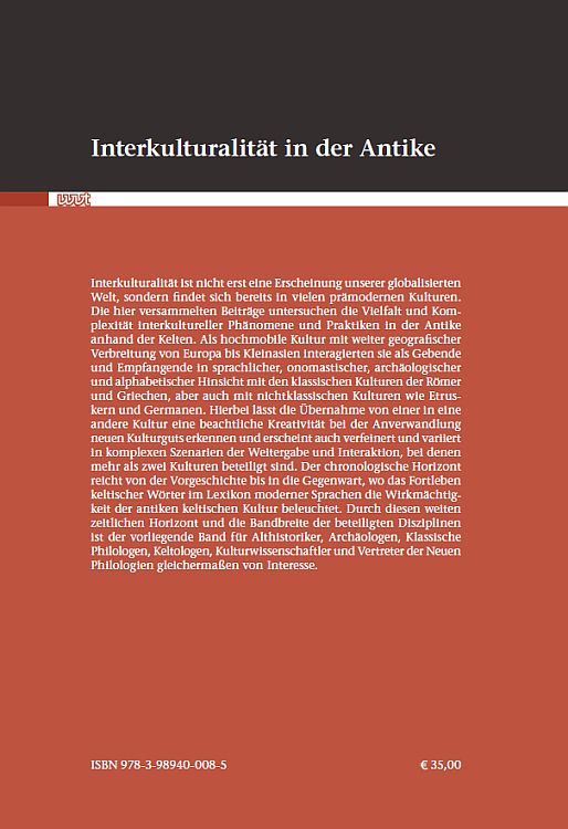 Interkulturalität ist nicht erst eine Erscheinung unserer globalisierten Welt, sondern findet sich bereits in vielen prämodernen Kulturen. Die hier versammelten Beiträge untersuchen die Vielfalt und Komplexität interkultureller Phänomene und Praktiken in der Antike anhand der Kelten. Als hochmobile Kultur mit weiter geografischer Verbreitung von Europa bis Kleinasien interagierten sie als Gebende und Empfangende in sprachlicher, onomastischer, archäologischer und alphabetischer Hinsicht mit den klassischen Kulturen der Römer und Griechen, aber auch mit nichtklassischen Kulturen wie Etruskern und Germanen. Hierbei lässt die Übernahme von einer in eine andere Kultur eine beachtliche Kreativität bei der Anverwandlung neuen Kulturguts erkennen und erscheint auch verfeinert und variiert in komplexen Szenarien der Weitergabe und Interaktion, bei denen mehr als zwei Kulturen beteiligt sind. Der chronologische Horizont reicht von der Vorgeschichte bis in die Gegenwart, wo das Fortleben keltischer Wörter im Lexikon moderner Sprachen die Wirkmächtigkeit der antiken keltischen Kultur beleuchtet. Durch diesen weiten zeitlichen Horizont und die Bandbreite der beteiligten Disziplinen ist der vorliegende Band für Althistoriker, Archäologen, Klassische Philologen, Keltologen, Kulturwissenschaftler und Vertreter der Neuen Philologien gleichermaßen von Interesse.