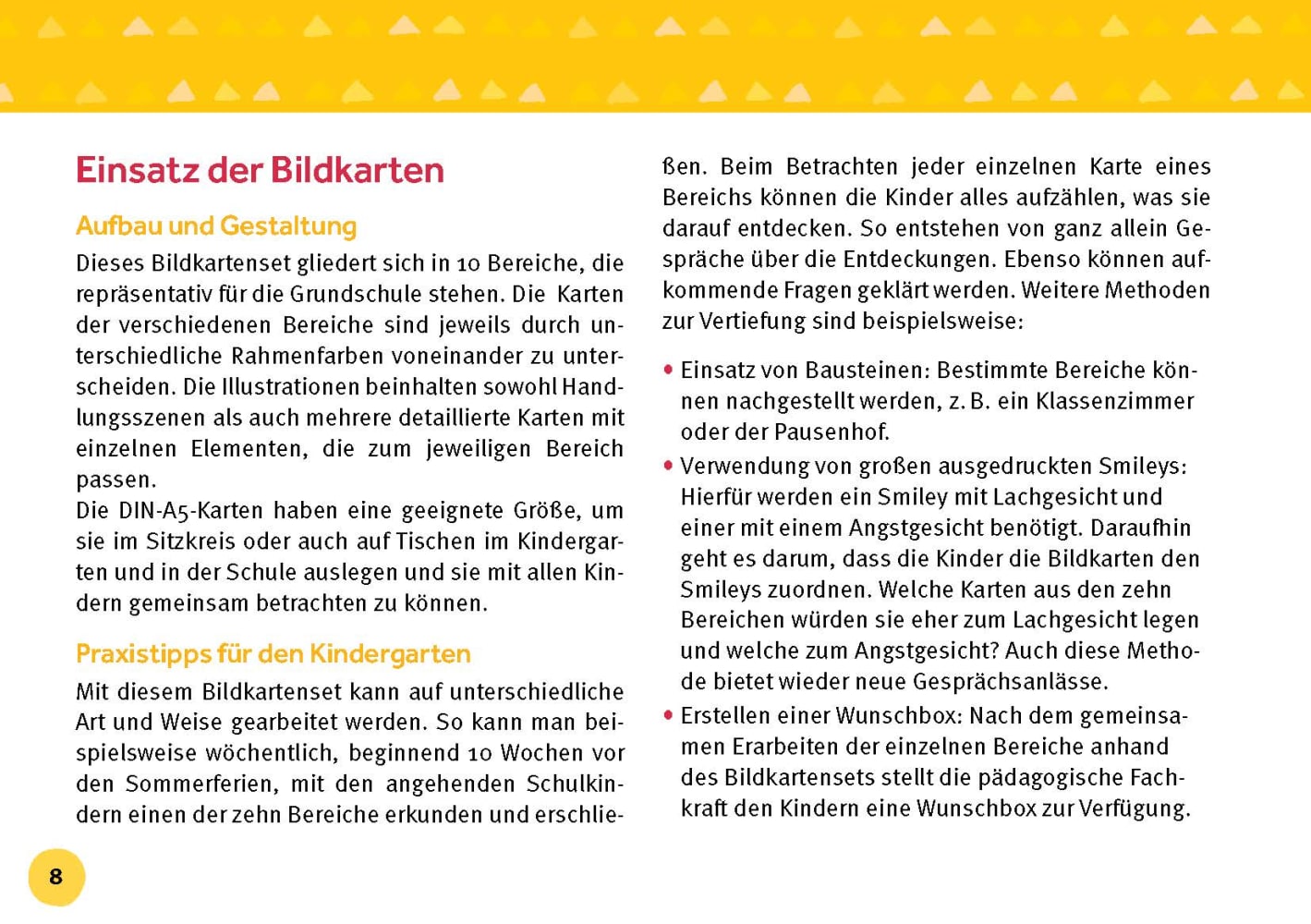 "Ich freue mich auf die Schule!" Wäre es nicht schön, wenn alle Kinder diesen Satz mit Überzeugung sagen könnten? Mit diesen Bildkarten zur Grundschule können Erzieherinnen und Pädagogen in Kita, Hort, Vorschule und Anfangsunterricht die Angst vor dem Unbekannten nehmen. Bilder aus verschiedenen Kategorien wie Spiel und Bewegung, Klassenzimmer oder Essen und Trinken regen zu Gesprächen an. So blicken angehende Erstklässler und Schulanfänger voller Vorfreude auf Einschulung und Schulzeit!