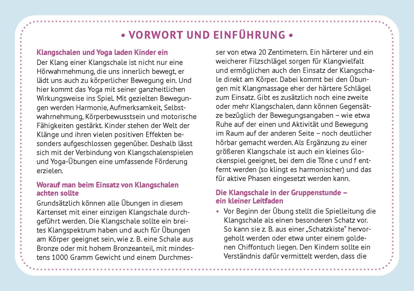 Bewegung meets Klang: Yoga und Klangschale bilden bei diesem Bildkarten-Set für kleine Yogis eine gelungene Einheit! Begleitet von sanften Tönen und Vibrationen gelingen die 30 Yoga-Übungen mit Kindern umso besser. Jede der Karten besteht aus einer passenden Illustration auf der Vorderseite und dem erklärenden Teil auf der Rückseite: Hier erhalten Sie neben der Anleitung für die Asanas auch Hinweise zum spezifischen Nutzen der jeweiligen Yoga-Übung.