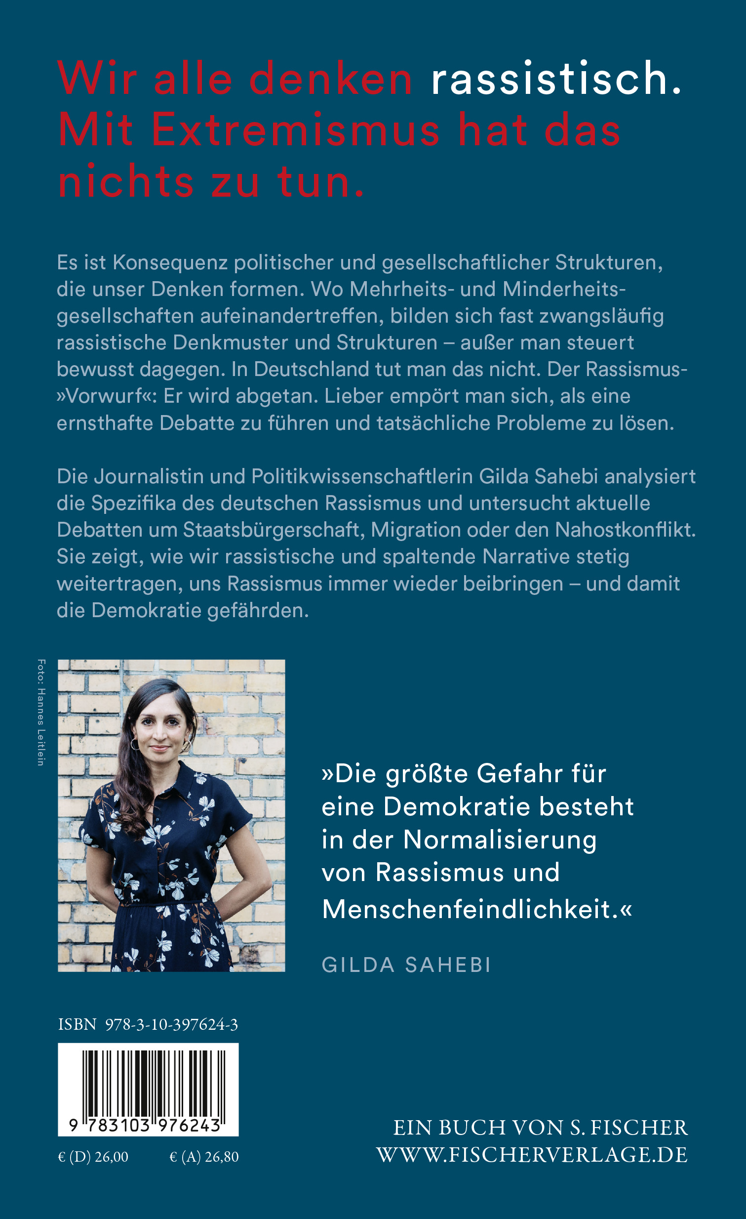 Die Journalistin und Politikwissenschaftlerin Gilda Sahebi zeigt in ihrer klaren Analyse: Wir alle denken rassistisch. Mit Extremismus hat das nichts zu tun. Sondern es ist Konsequenz politischer und gesellschaftlicher Strukturen, die unser Denken und unser Handeln formen. Wo Mehrheits- und Minderheitsgesellschaften aufeinandertreffen, bilden sich fast zwangsläufig rassistische Denkmuster und Strukturen – außer man steuert bewusst dagegen. In Deutschland tut man das nicht. Der Rassismus-»Vorwurf«: Er wird abgetan. Lieber empört man sich, als eine ernsthafte Debatte zu führen und tatsächliche Probleme zu lösen.