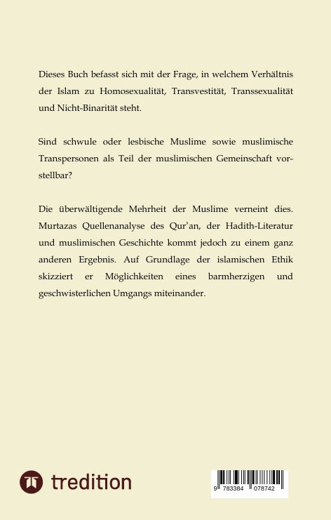 Dieses Buch befasst sich mit der Frage, in welchem Verhältnis der Islam zu Homosexualität, Transvestität, Transsexualität und Nicht-Binarität steht.Sind schwule oder lesbische Muslime sowie muslimische Transpersonen als Teil der muslimischen Gemeinschaft vorstellbar?Die überwältigende Mehrheit der Muslime verneint dies. Murtazas Quellenanalyse des Qur an, der Hadith-Literatur und muslimischen Geschichte kommt jedoch zu einem ganz anderen Ergebnis. Auf Grundlage der islamischen Ethik skizziert er Möglichkeiten eines barmherzigen und geschwisterlichen Umgangs miteinander.2. aktualisierte und verbesserte Auflage im neuen Buchumschlag.