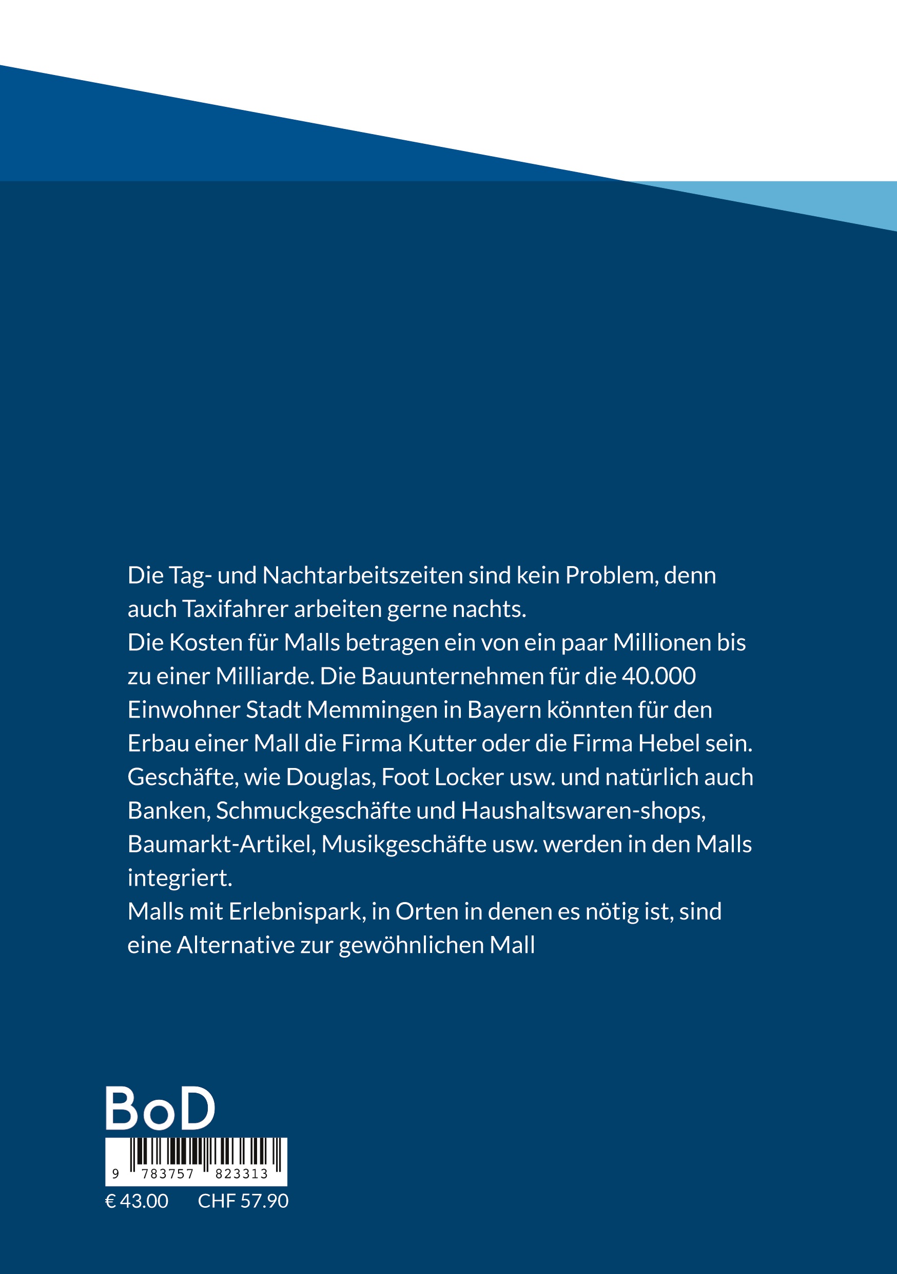 Die Tag- und Nachtarbeitszeiten sind kein Problem, denn auch Taxifahrer arbeiten gerne nachts.Die Kosten für Malls betragen von ein paar Millionen bis zu einer Milliarde. Die Bauunternehmen für die 40.000 Einwohner Stadt Memmingen in Bayern könnten für den Erbau einer Mall die Firma Kutter oder die Firma Hebel sein.Geschäfte, wie Douglas, Foot Locker usw. und natürlich auch Banken, Schmuckgeschäfte und Haushaltswarenshops, Baumarkt-Artikel, Musikgeschäfte usw. werden in den Malls integriert.Malls mit Erlebnispark, in Orten in denen es nötig ist, sind eine Alternative zur gewöhnlichen Mall