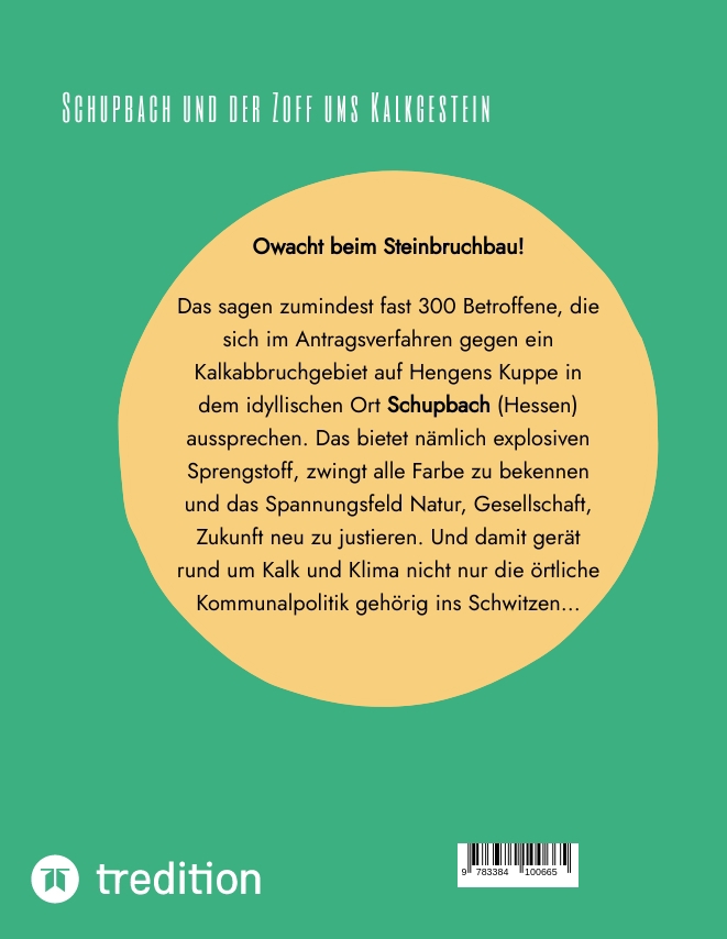Owacht beim Steinbruchbau!Das sagen zumindest fast 300 Betroffene, die sich im Antragsverfahren gegen ein Kalkabbruchgebiet auf Hengens Kuppe in dem beschaulichen Ort Schupbach (Hessen) aussprechen. Das bietet nämlich explosiven Sprengstoff, zwingt die Bevölkerung Farbe zu bekennen, das Spannungsfeld Natur, Gesellschaft, Zukunft neu zu justieren. Und das bringt nunmehr im verflixten 7. Jahr nicht nur die örtliche Kommunalpolitik ins Schwitzen, sondern bereitet auch dem zuständigen Regierungspräsidium in Gießen Kopfzerbrechen, das eine politisch nicht lösbare Sachfrage zu entscheiden hat. Doch solange Deutungshoheiten, wie sie Kunst, Wissenschaft, Religion, Landwirtschaft, Medien, Soziologie, Ökologie anbieten, ungehört verhallen, wird der Zoff in Schupbach rund um Klima und Kalk keine Ruhe finden.