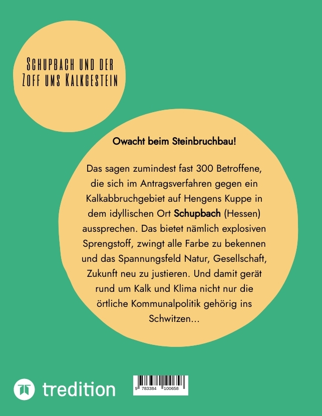 Owacht beim Steinbruchbau!Das sagen zumindest fast 300 Betroffene, die sich im Antragsverfahren gegen ein Kalkabbruchgebiet auf Hengens Kuppe in dem beschaulichen Ort Schupbach (Hessen) aussprechen. Das bietet nämlich explosiven Sprengstoff, zwingt die Bevölkerung Farbe zu bekennen, das Spannungsfeld Natur, Gesellschaft, Zukunft neu zu justieren. Und das bringt nunmehr im verflixten 7. Jahr nicht nur die örtliche Kommunalpolitik ins Schwitzen, sondern bereitet auch dem zuständigen Regierungspräsidium in Gießen Kopfzerbrechen, das eine politisch nicht lösbare Sachfrage zu entscheiden hat. Doch solange Deutungshoheiten, wie sie Kunst, Wissenschaft, Religion, Landwirtschaft, Medien, Soziologie, Ökologie anbieten, ungehört verhallen, wird der Zoff in Schupbach rund um Klima und Kalk keine Ruhe finden.