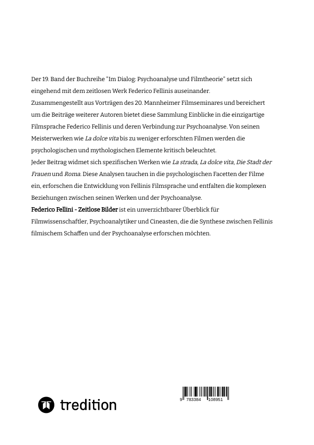 Der 19. Band der Buchreihe "Im Dialog: Psychoanalyse und Filmtheorie" setzt sich eingehend mit dem zeitlosen Werk Federico Fellinis auseinander.Zusammengestellt aus Vorträgen des 20. Mannheimer Filmseminares und bereichert um die Beiträge weiterer Autoren bietet diese Sammlung Einblicke in die einzigartige Filmsprache Federico Fellinis und deren Verbindung zur Psychoanalyse. Von seinen Meisterwerken wie La dolce vita bis zu weniger erforschten Filmen werden die psychologischen und mythologischen Elemente kritisch beleuchtet.Jeder Beitrag widmet sich spezifischen Werken wie La strada, La dolce vita, Die Stadt der Frauen und Roma. Diese Analysen tauchen in die psychologischen Facetten der Filme ein, erforschen die Entwicklung von Fellinis Filmsprache und entfalten die komplexen Beziehungen zwischen seinen Werken und der Psychoanalyse.Federico Fellini - Zeitlose Bilder ist ein unverzichtbarer Überblick für Filmwissenschaftler, Psychoanalytiker und Cineasten, die die Synthese zwischen Fellinis filmischem Schaffen und der Psychoanalyse erforschen möchten.