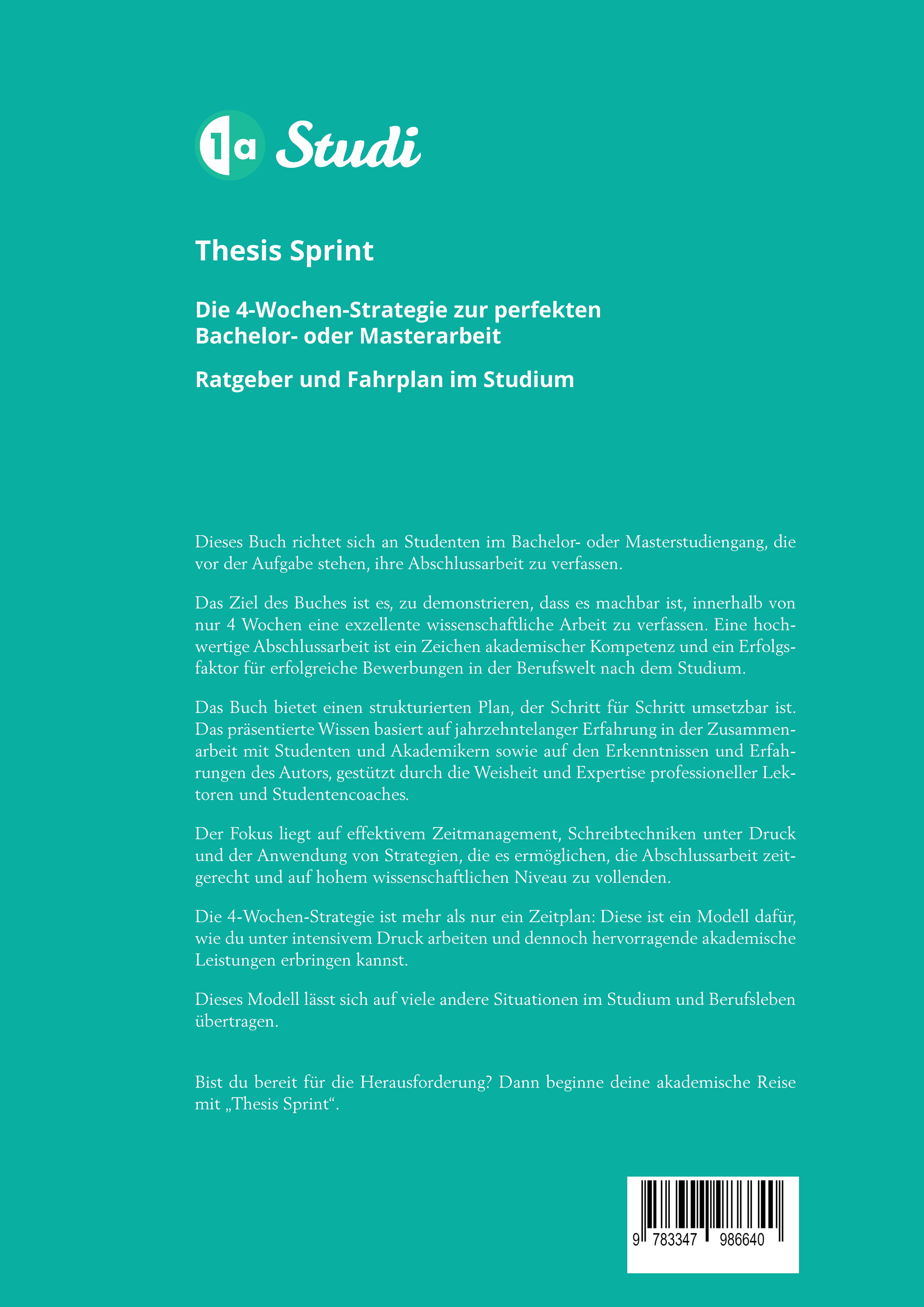 In "Thesis Sprint: Die 4-Wochen-Strategie zur perfekten Bachelor- oder Masterarbeit" findest du eine funktionierende Methode, um deine Abschlussarbeit in nur 4 Wochen zu schreiben. Dieses Buch ist genau das Richtige für dich, wenn du vor der Herausforderung stehst, eine qualitativ hochwertige Thesis unter Zeitdruck zu schreiben. Die Abschlussarbeit hat einen erheblichen Einfluss auf deinen Gesamtnotendurchschnitt und somit Bewerbung auf einen Job nach dem Studium.In diesem Buch (+ Workbook) lernst du, wie du effektives Zeitmanagement, das Schreiben unter Druck und bewährte Schreibtechniken nutzen kannst, um deine Arbeit fristgerecht und auf einem hohen wissenschaftlichen Niveau zu vollenden. Dieses Buch ist das Ergebnis jahrzehntelanger Erfahrung in der Zusammenarbeit mit Studenten und Akademikern und kombiniert Expertenwissen mit den Ratschlägen professioneller Lektoren und Studentencoaches.Du lernst, wie du den Schreibprozess deiner Thesis effektiv und effizient organisierst und diese Herausforderung mit Entschlossenheit und Engagement angehst. Die 4-Wochen-Strategie ist mehr als ein Zeitplan - diese ist ein Modell, wie du unter Druck arbeiten und dabei hervorragende Ergebnisse erzielen kannst. Diese Strategie wird dir nicht nur während deines Studiums, sondern auch in deinem späteren Berufsleben nützlich sein.