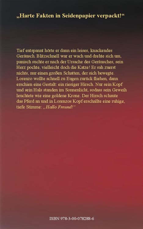 Tief entspannt hörte er dann ein leises, knackendes Geräusch. Blitzschnell war er wach und drehte sich um, panisch suchte er nach der Ursache des Geräusches, sein Herz pochte, vielleicht doch die Katze! Er sah zuerst nichts, nur einen großen Schatten, der sich bewegte. Lorenzo wollte schnell zu Eugen zurück fliehen, dann erschien eine Gestalt: ein riesiger Hirsch. Nur sein Kopf und sein Hals standen im Sonnenlicht, sodass sein Geweih leuchtete wie eine goldene Krone. Der Hirsch schaute das Pferd an und in Lorenzos Kopf erschallte eine ruhige tiefe Stimme: “Hallo Freund!”.