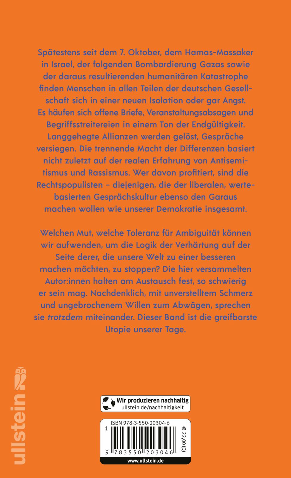 Welchen Mut, welche Kraft und Toleranz für Ambiguität und Streit können wir, müssen wir gar, aufwenden, um die Logik der Verhärtung auf der Seite derer, die unsere Welt zu einer besseren machen möchten, zu stoppen? Die hier versammelten Autor:innen halten am Austausch fest, so schwierig er sein mag. Nachdenklich, mit unverstelltem Schmerz und ungebrochenem Willen zum wechselseitigen Abwägen sprechen sie trotzdem miteinander. Dieser Band ist die greifbarste Utopie unserer Tage.