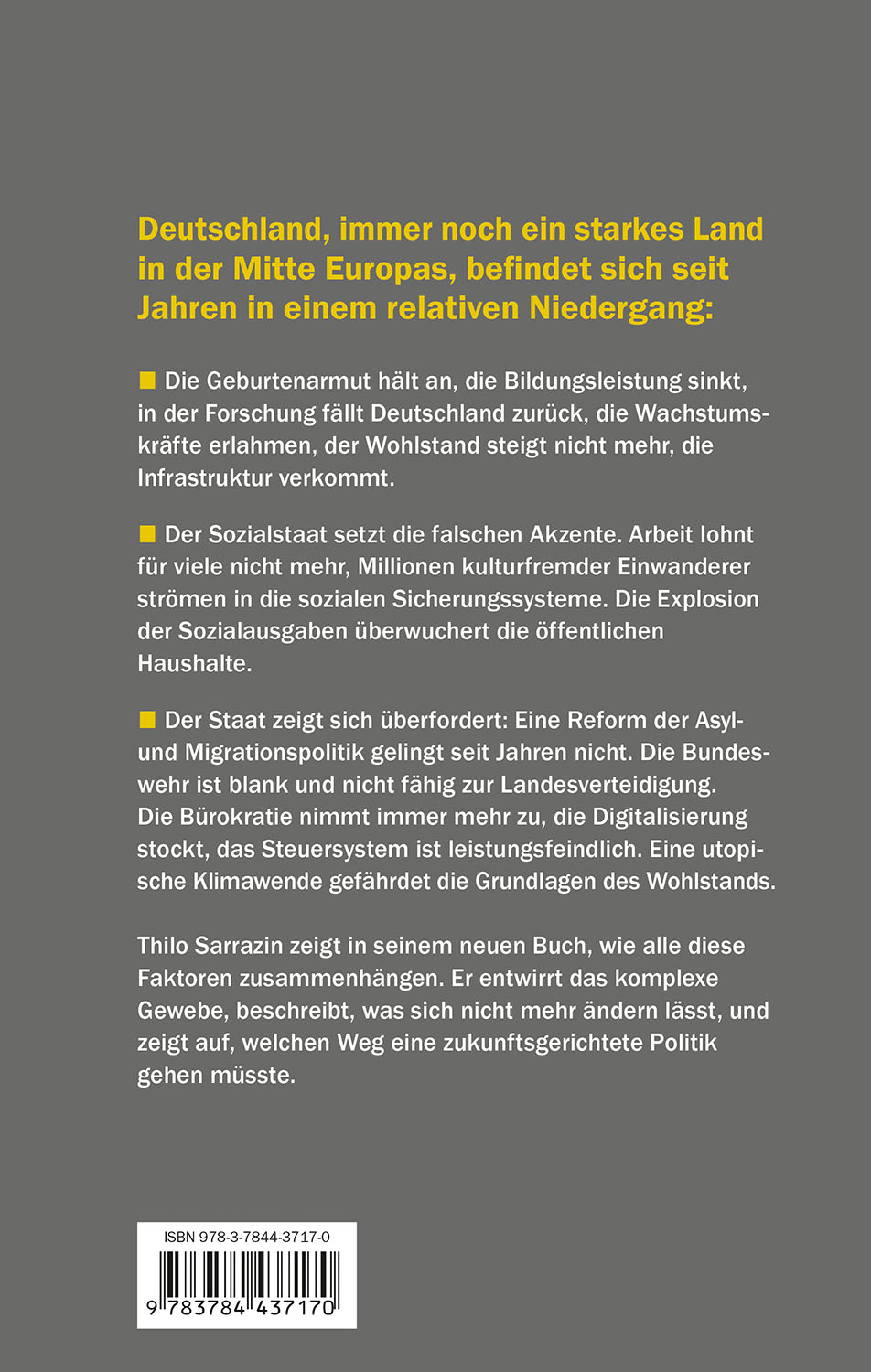 Thilo Sarrazin zeigt in seinem neuen Buch, wie alle diese Faktoren zusammenhängen. Er entwirrt das komplexe Gewebe, beschreibt, was sich nicht mehr ändern lässt, und zeigt auf, welchen Weg eine zukunftsgerichtete Politik gehen müsste.