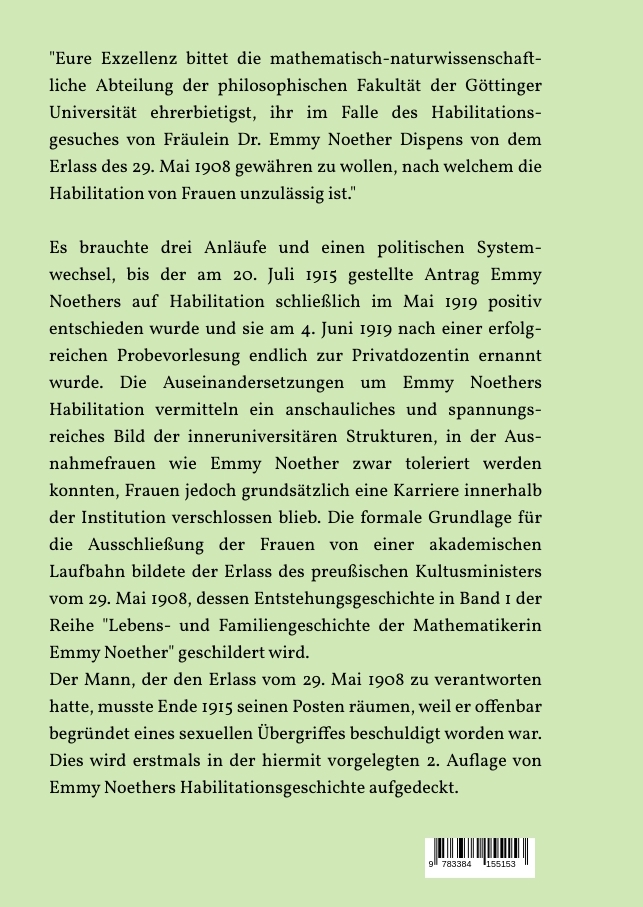 In dieser zweiten Auflage wird außerdem erstmals aufgedeckt, dass der Mann, der das Verbot von Frauenhabilitationen zu verantworten hatte, 1915 seinen Posten räumen musste, weil er eines sexuellen Übergriffs überführt worden war.
